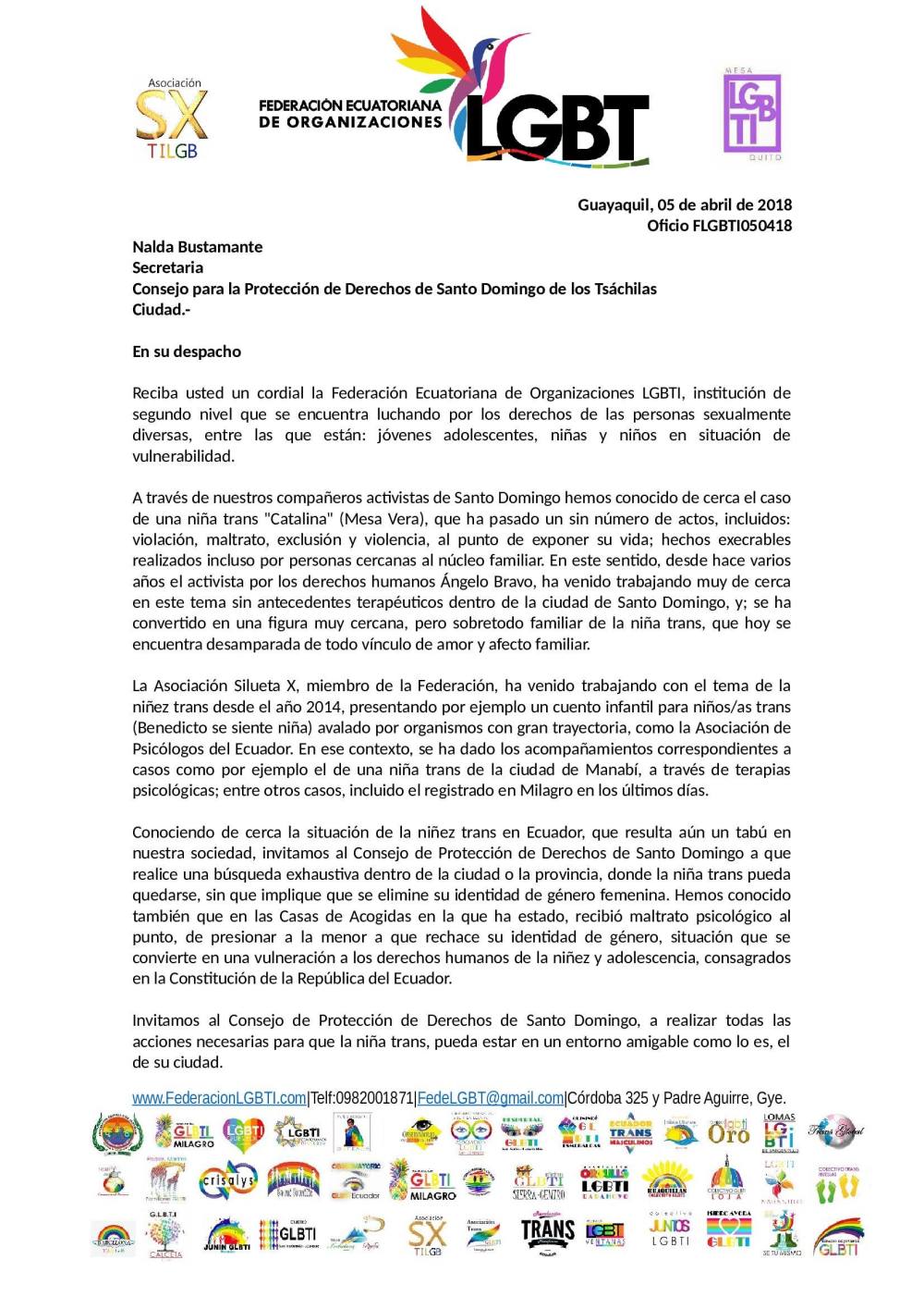 También, ponemos a su disposición las terapias psicológicas que desarrolla la Asociación Silueta X para casos de niñez trans, misma que pueden ser movilizadas hasta Santo Domingo, sin ningún inconveniente para un tratamiento humanista de la niña trans antes mencionada. Así mismo, la Asociación “Es Mi Familia”, que forma parte de la Mesa LGBTIQ+ de Quito, se encuentra capacitada para tratar casos de violencia, las cuales se encuentran a su disposición.