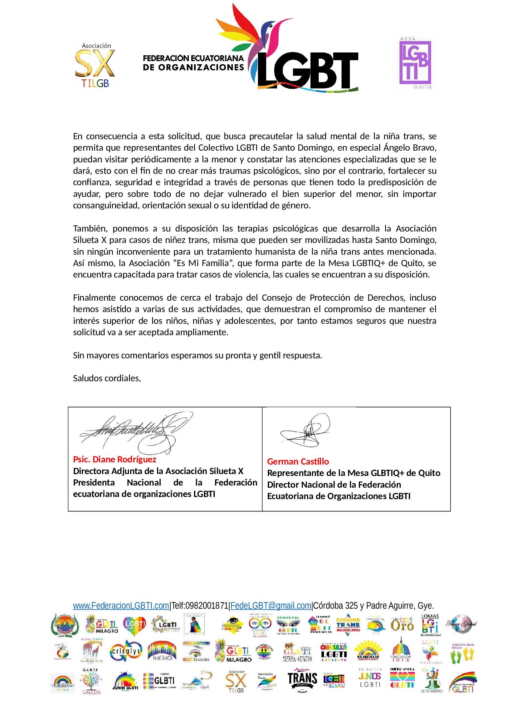También, ponemos a su disposición las terapias psicológicas que desarrolla la Asociación Silueta X para casos de niñez trans, misma que pueden ser movilizadas hasta Santo Domingo, sin ningún inconveniente para un tratamiento humanista de la niña trans antes mencionada. Así mismo, la Asociación “Es Mi Familia”, que forma parte de la Mesa LGBTIQ+ de Quito, se encuentra capacitada para tratar casos de violencia, las cuales se encuentran a su disposición.