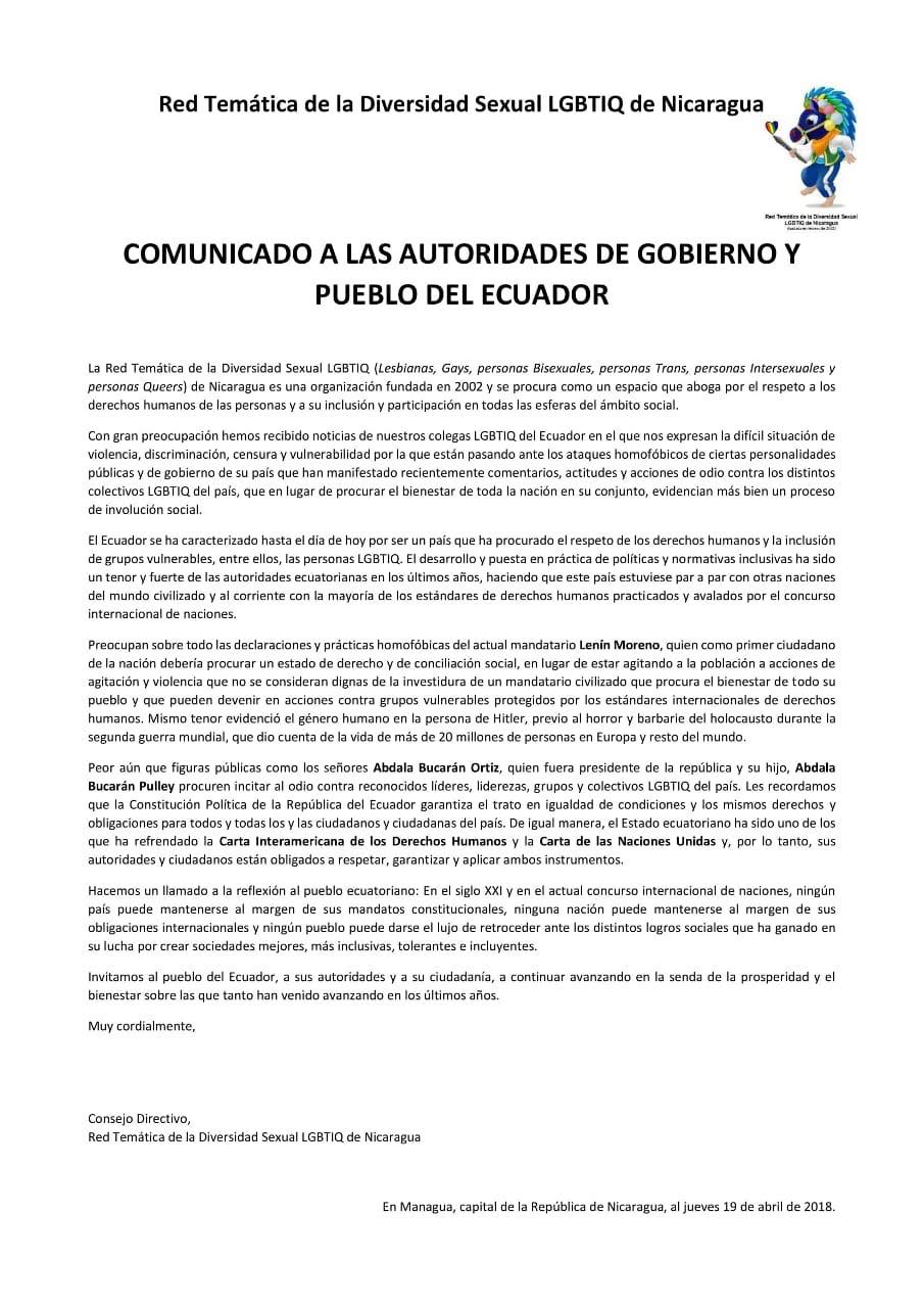 Peor aún que figuras públicas como los señores Abdala Bucarán Ortiz, quien fuera presidente de la república y su hijo, Abdala Bucarán Pulley procuren incitar al odio contra reconocidos lideres, liderezas, grupos y colectivos LGBTIQ del país. Les recordamos que la Constitución Política de la República del Ecuador garantiza el trato en igualdad de condiciones y los mismos derechos y obligaciones para todos y todas los y las ciudadanos y ciudadanas del país. De igual manera, el estado ecuatoriano ha sido uno de los que ha refrendado la Carta Interamericana de los Derechos Humanos y la Carta de las Naciones Unidas y, por lo tanto, sus autoridades y ciudadanos están obligados a respetar, garantizar y aplicar ambos instrumentos.