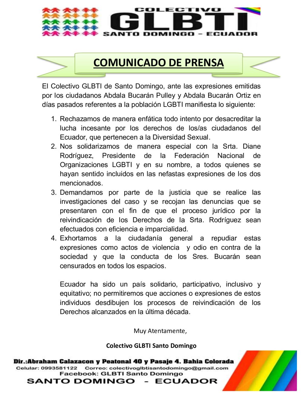 El Colectivo GLBTI de Santo Domingo, ante las expresiones emitidas