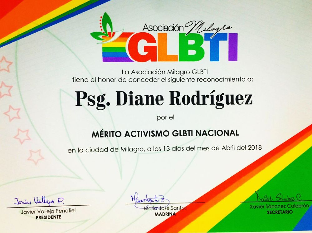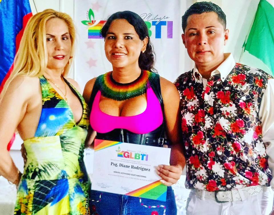 El colectivo GLBTI de Milagro realizó entrega de reconocimientos a varias autoridades a nivel nacional. Entre estos, entrego un reconocimiento a la asambleísta y presidenta de la Federación Ecuatoriana de Organizaciones LGBTI Diane Rodríguez, por su contribución a favor de las poblaciones de diversa condición sexual.