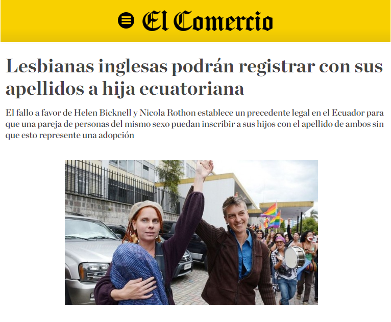 El fallo a favor de Helen Bicknell y Nicola Rothon establece un precedente legal en el Ecuador para que una pareja de personas del mismo sexo puedan inscribir a sus hijos con el apellido de ambos sin que esto represente una adopción