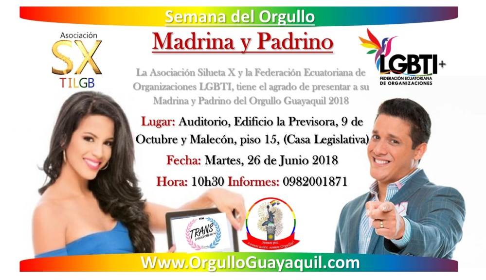 La Asociación Silueta X y la Federación Ecuatoriana de Organizaciones LGBTI, tienen el agrado de presentar a su Madrina y Padrino del Orgullo Guayaquil 2018.