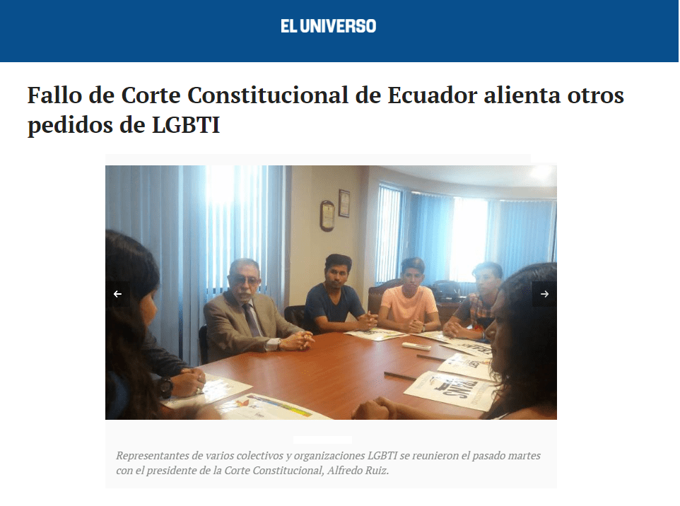 El matrimonio igualitario y la adopción son dos de los temas que más le interesan a Bravo, del Observatorio Antiacoso Callejero Ecuador, y a otros miembros de colectivos LGBTI que empiezan a acercarse a la CC ante lo que califican como “logros” alcanzados con la sentencia emitida en mayo pasado por este organismo, y que dio paso a que dos ciudadanas inglesas puedan registrar a una menor con los apellidos de las “dos madres”.