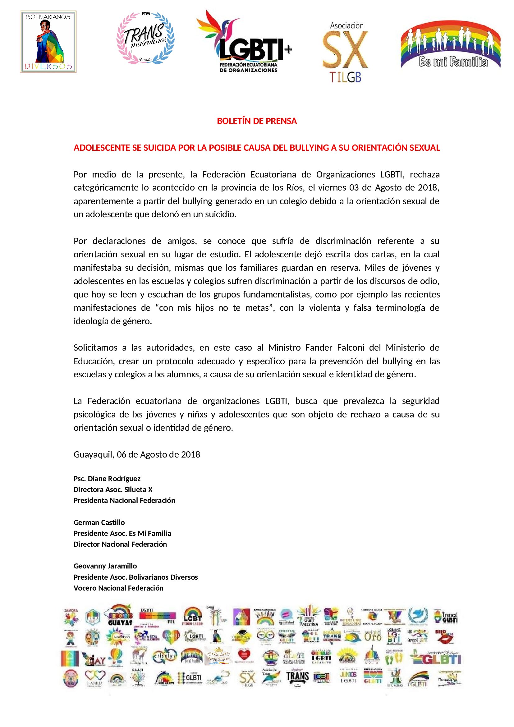 Por medio de la presente, la Federación Ecuatoriana de Organizaciones LGBTI, rechaza categóricamente lo acontecido en la provincia de los Ríos, el viernes 03 de Agosto de 2018, aparentemente a partir del bullying generado en un colegio debido a la orientación sexual de un adolescente que detonó en un suicidio.