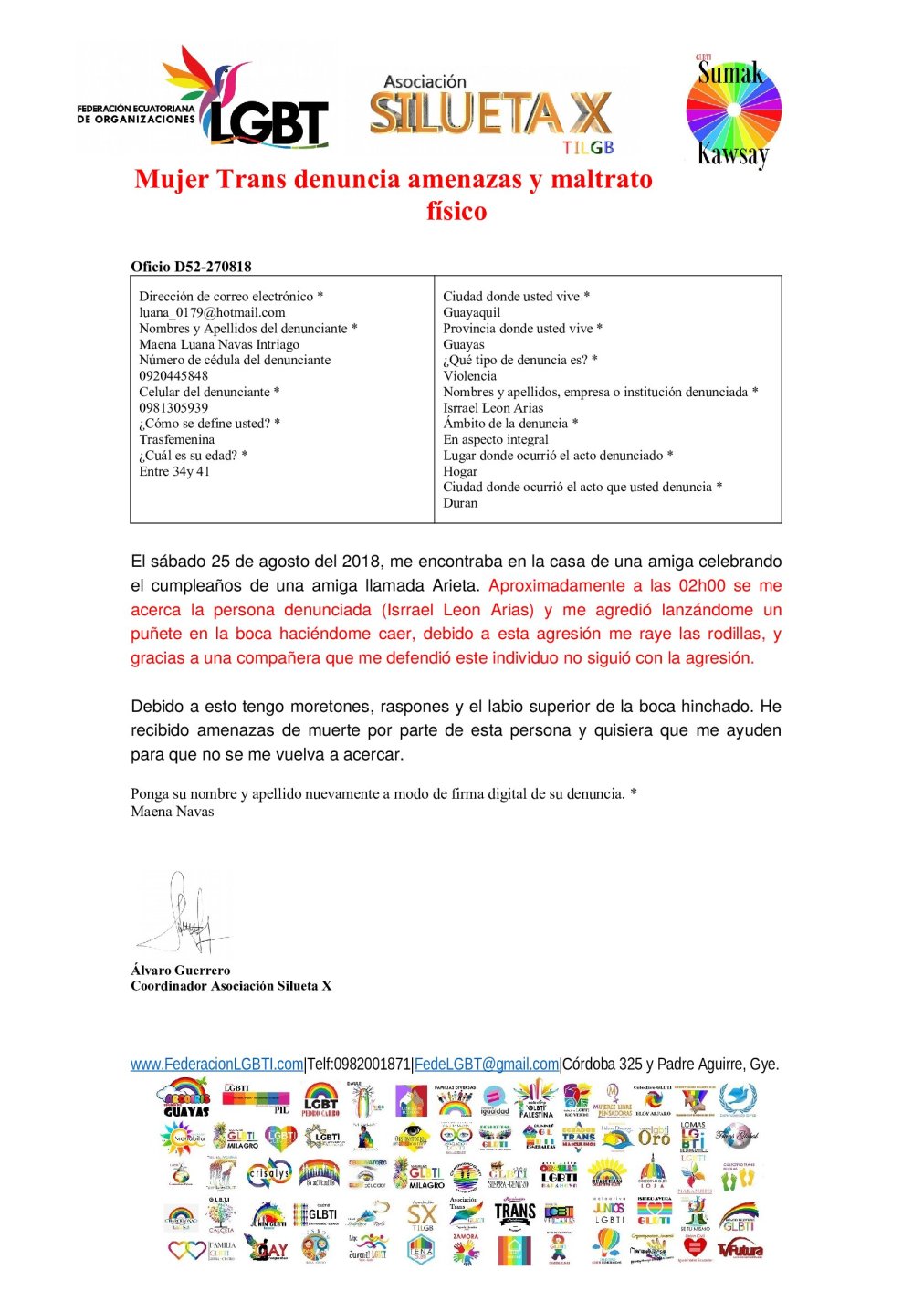 Mujer Trans denuncia amenazas y maltrato físico-Federacion Ecuatoriana LGBTI-Asociacion Silueta X