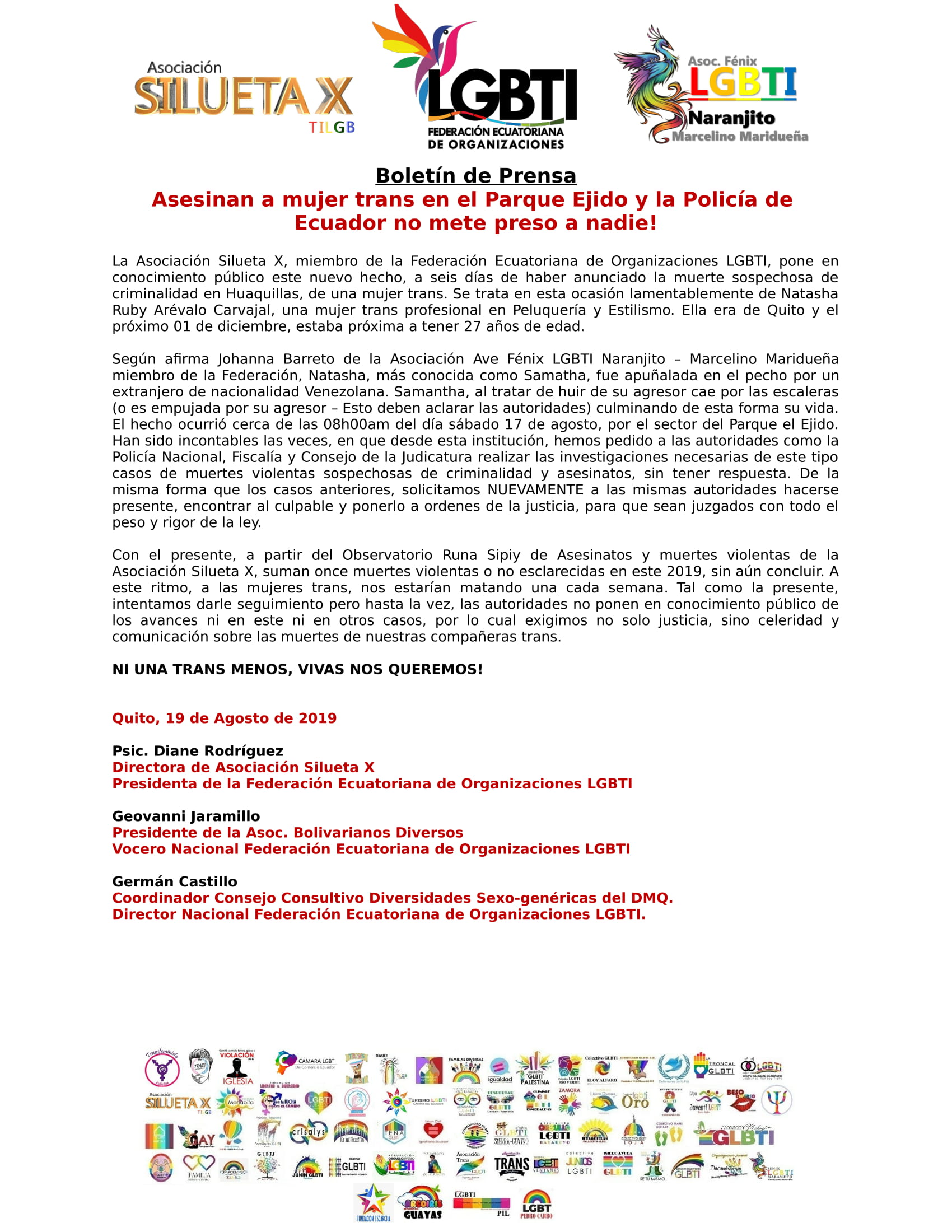 Asesinan a mujer trans en Parque El Ejido y nadie va preso en Ecuador – Asociación SIlueta X – Federación Ecuatoriana de Organizaciones LGBTI-1