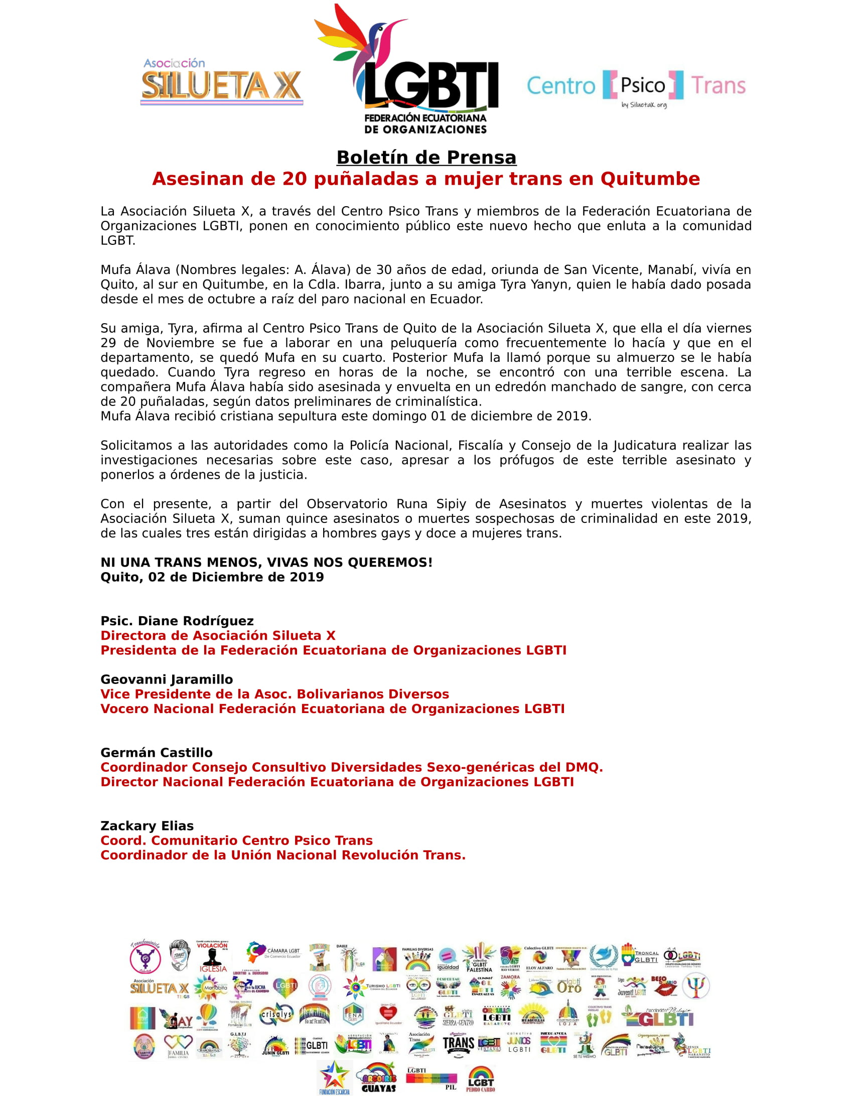 Asesinan de 20 puñaladas a mujer trans en Quitumbe – Asociación Silueta X – Federación Ecuatoriana de Organizaciones LGBTI-1