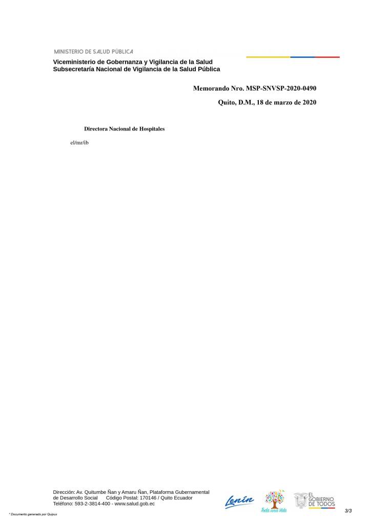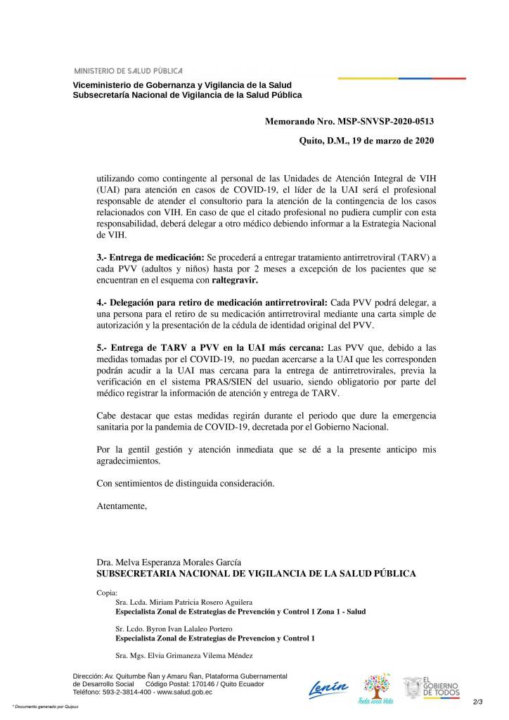 2.Que se entregue medicamentos a las PVVs para 3 meses. por el momento y solamente a los que acuden al Hospital de Infectologia «Dr. Jose Daniel Rodriguez Maridueña», debido a la alta demanda de sintomaticos respiratorios registrados en este Establecimiento de salud y asi poder optimizar el tiempo del personal de salud.