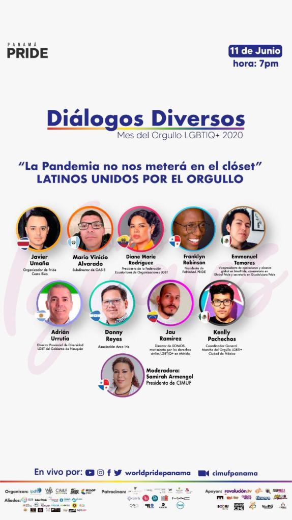 Diálogos Diversos por el mes del Orgullo LGBTIQ+ 2020 Latinos unidos por el orgullo. la pandemia no nos meterá en el closet. 11 de junio de 2020 por facelive de WorldPridePanama.