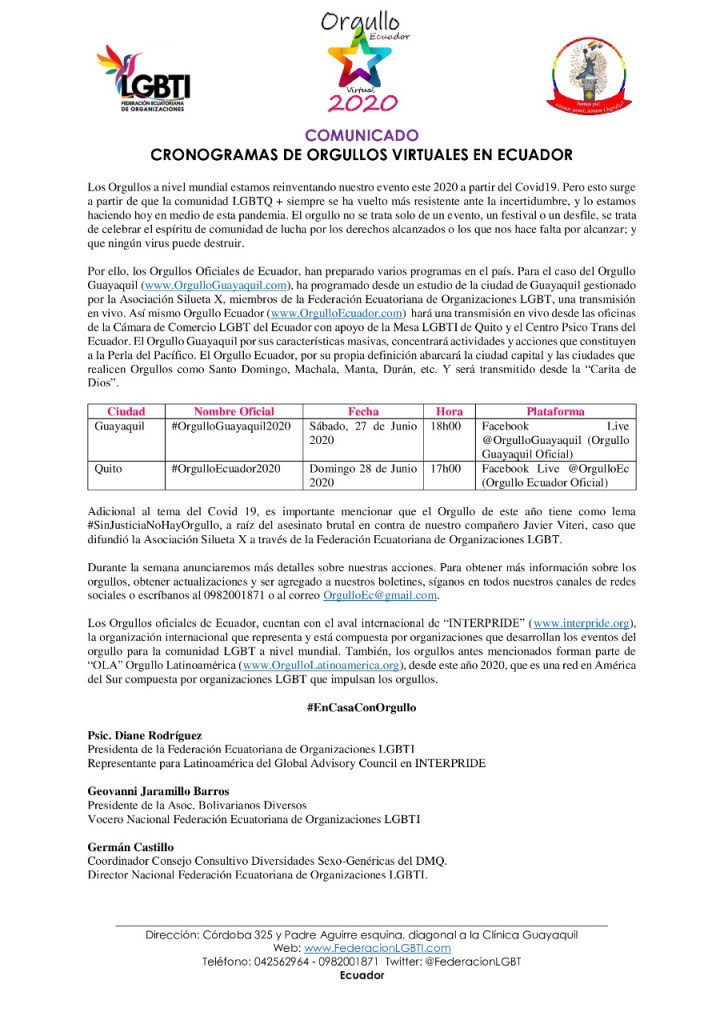 Adicional al tema del Covid 19, es importante mencionar que el Orgullo de este año tiene como lema #SinJusticiaNoHayOrgullo, a raíz del asesinato brutal en contra de nuestro compañero Javier Viteri, caso que difundió la Asociación Silueta X a través de la Federación Ecuatoriana de Organizaciones LGBT.