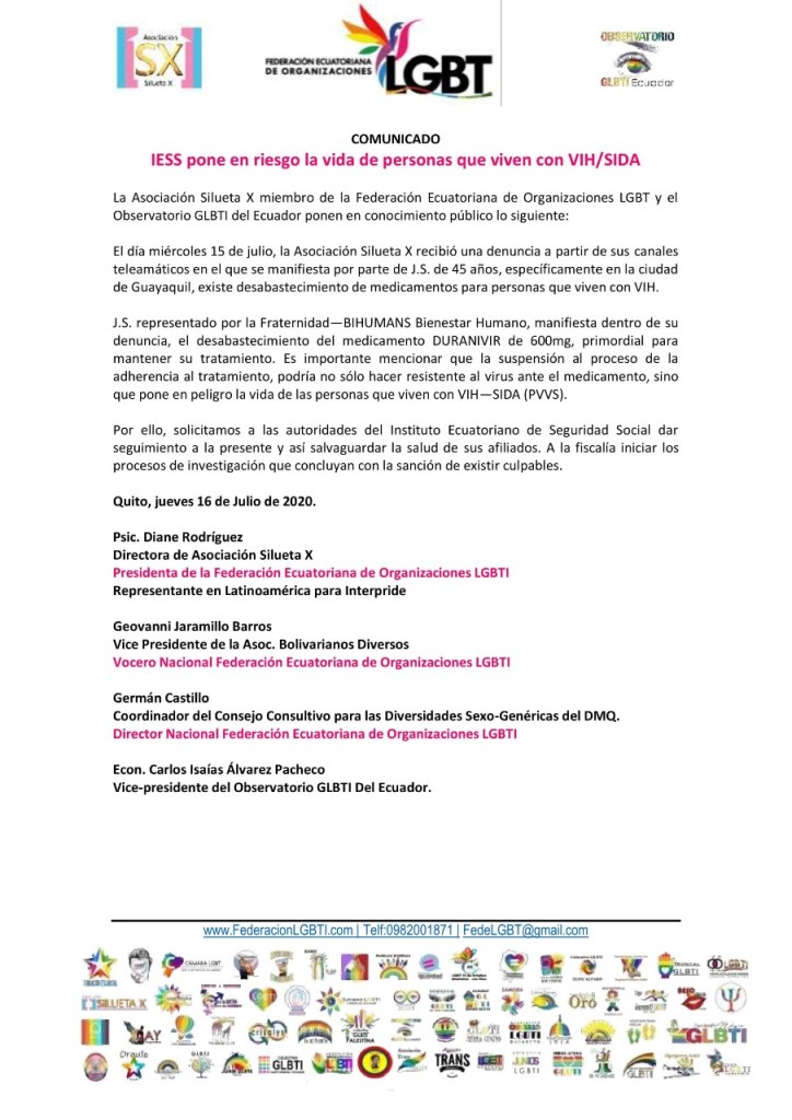 Observatorio GLBTI del Ecuador ponen en conocimiento público lo siguiente: