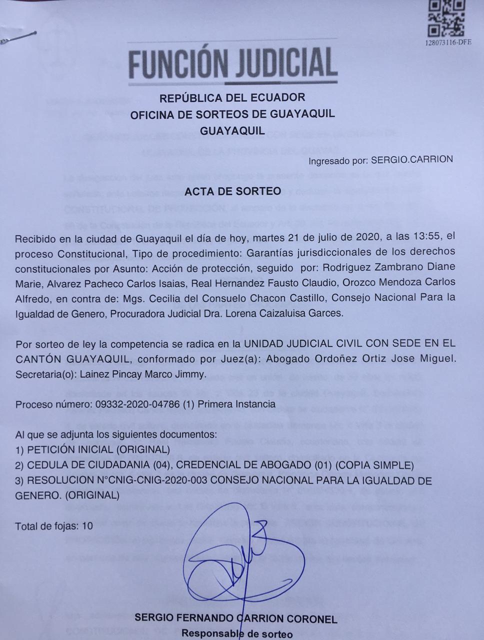 Acta de Sorte Jdicatura – ACCIÓN DE PROTECCIÓN CONTRA EL CONSEJO PARA LA IGUALDAD DE GÉNERO PARA LA CONFORMACIÓN DEL CONSEJO CONSULTIVO LGBTI – Asociación Silueta X Ecuador