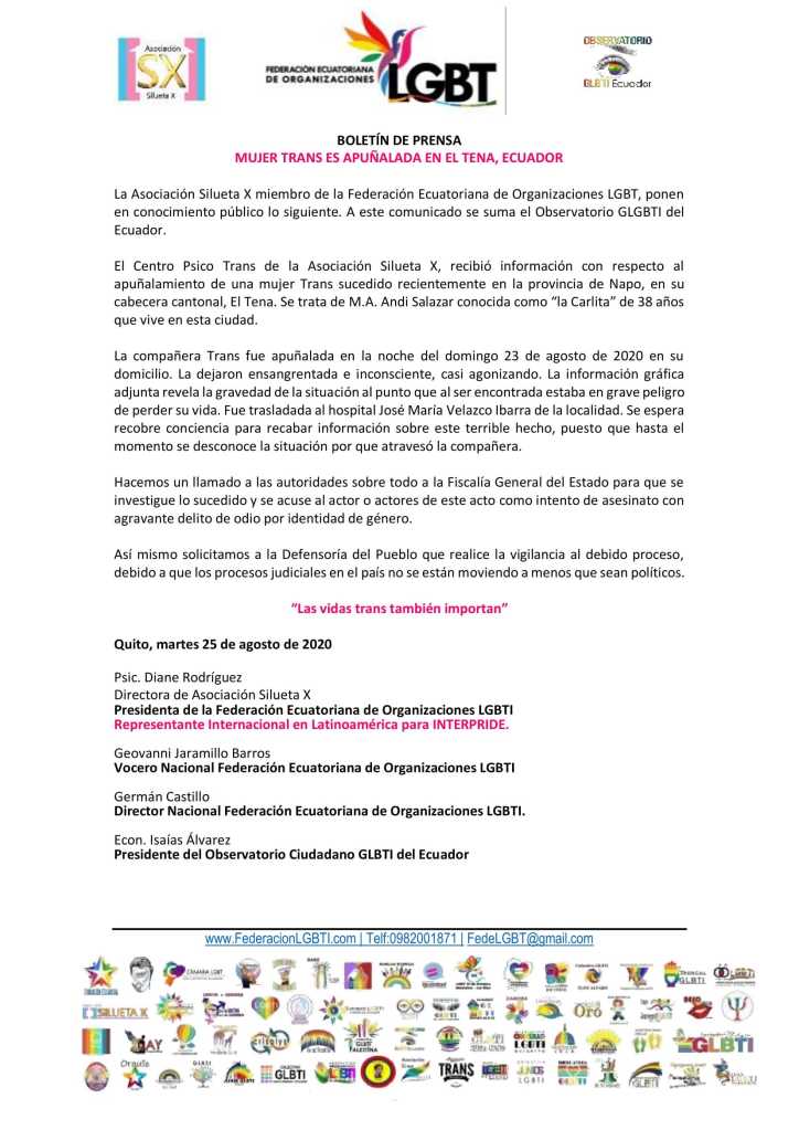 La Asociación Silueta X miembro de la Federación Ecuatoriana de Organizaciones LGBT, ponen en conocimiento público lo siguiente. A este comunicado se suma el Observatorio GLGBTI del Ecuador.