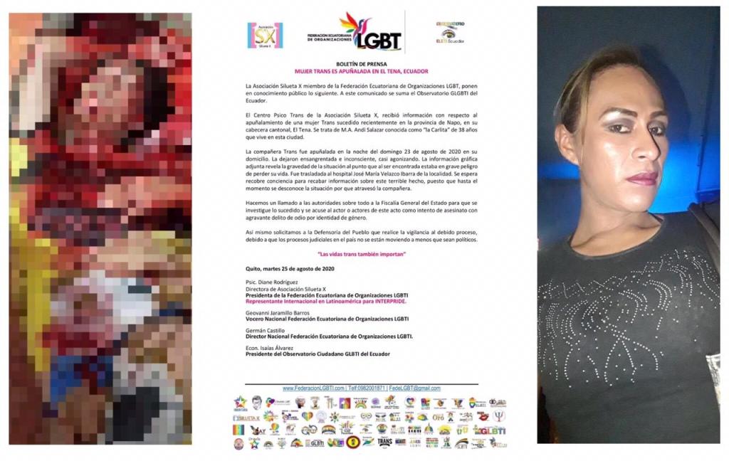 El Centro Psico Trans de la Asociación Silueta X, recibió información con respecto al apuñalamiento de una mujer Trans sucedido recientemente en la provincia de Napo, en su cabecera cantonal, El Tena. Se trata de M.A. Andi Salazar conocida como “la Carlita” de 38 años que vive en esta ciudad.