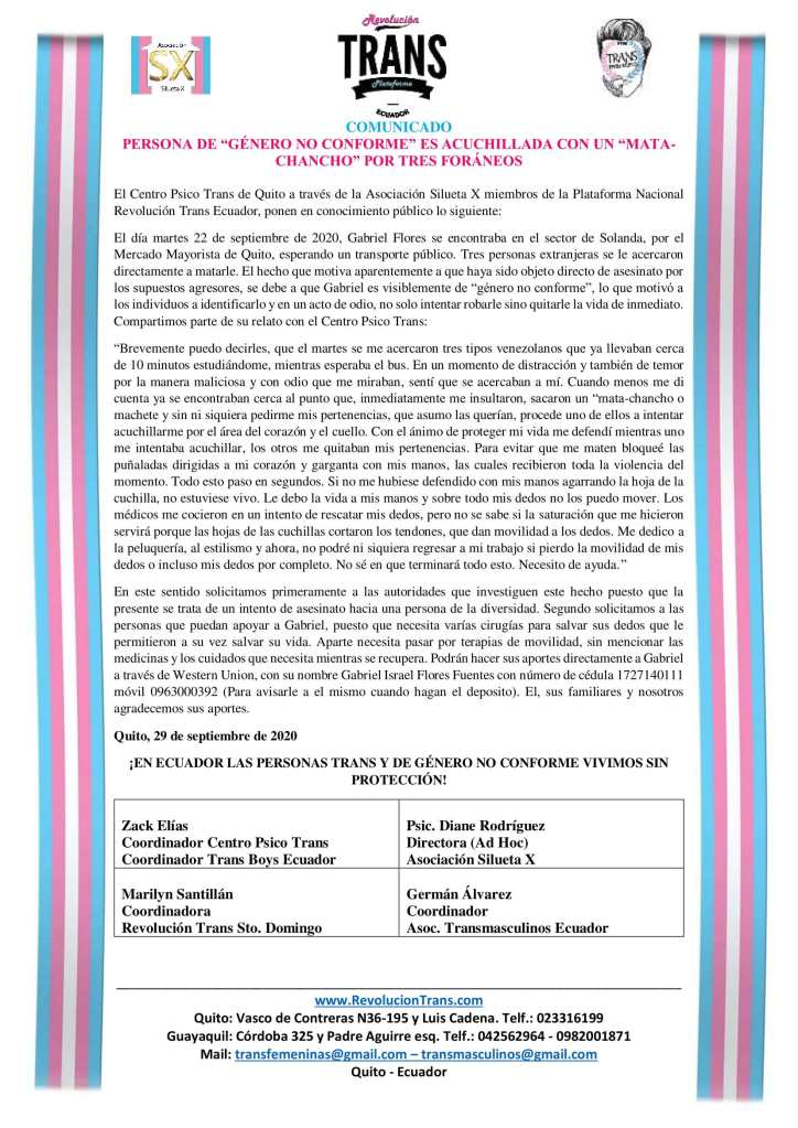 El Centro Psico Trans de Quito a través de la Asociación Silueta X miembros de la Plataforma Nacional Revolución Trans Ecuador, ponen en conocimiento público lo siguiente: