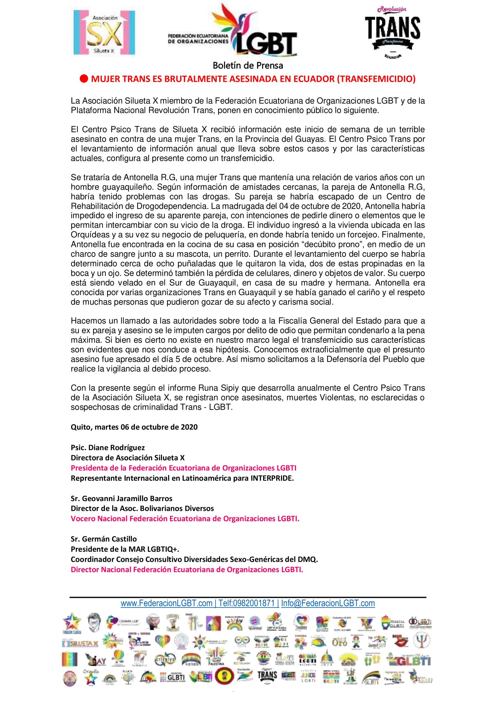 La Asociación Silueta X miembro de la Federación Ecuatoriana de Organizaciones LGBT y de la Plataforma Nacional Revolución Trans, ponen en conocimiento público lo siguiente.