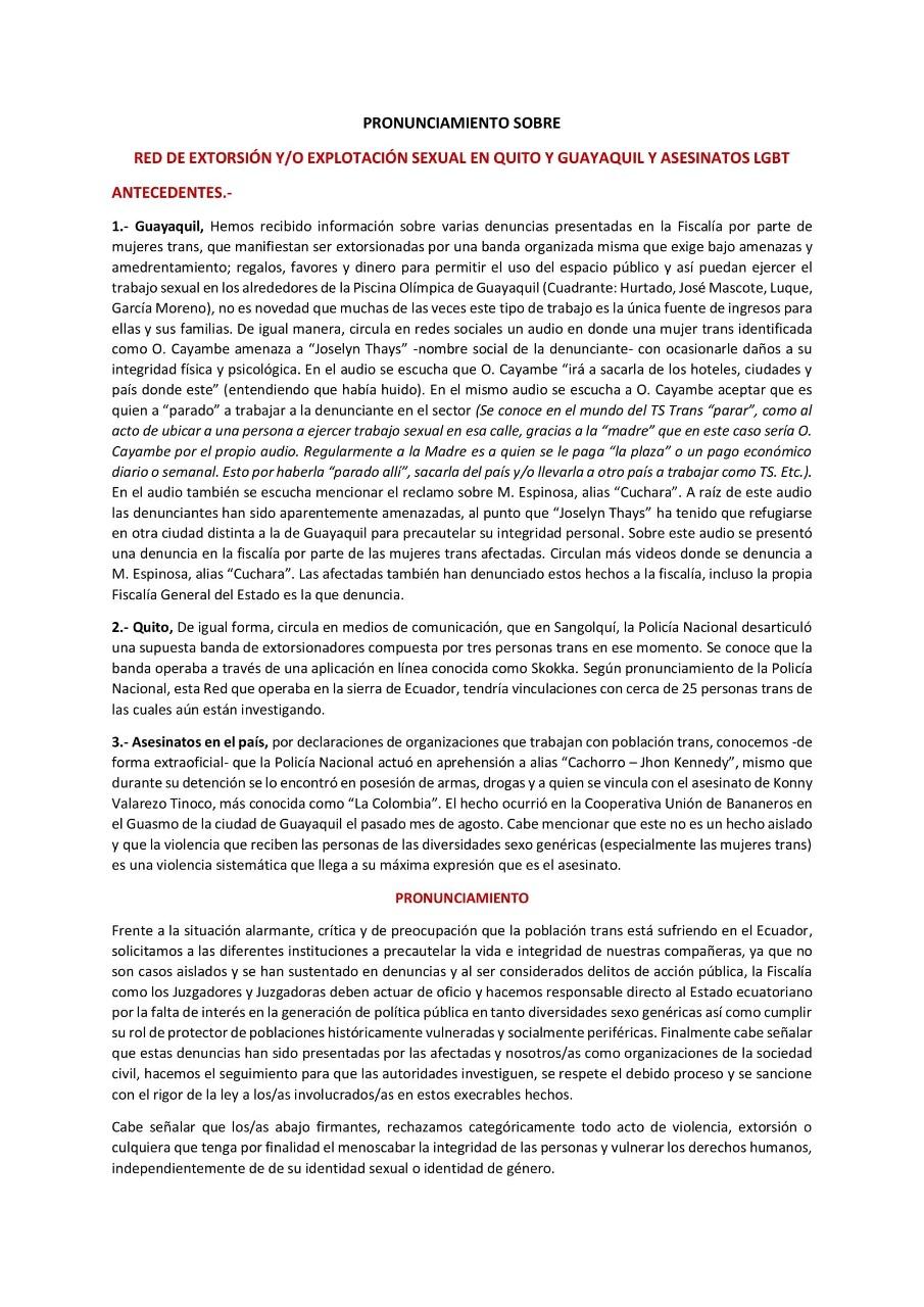Frente a la situación alarmante, crítica y de preocupación que la población trans está sufriendo en el Ecuador, solicitamos a las diferentes instituciones a pre cautelar la vida e integridad de nuestras compañeras, ya que no son casos aislados y se han sustentado en denuncias y al ser considerados delitos de acción pública, la Fiscalía como los Juzgadores y Juzgadoras deben actuar de oficio y hacemos responsable directo al Estado ecuatoriano por la falta de interés en la generación de política pública en tanto diversidades sexo genéricas así como cumplir su rol de protector de poblaciones históricamente vulneradas y socialmente periféricas. Finalmente cabe señalar que estas denuncias han sido presentadas por las afectadas y nosotros/as como organizaciones de la sociedad civil, hacemos el seguimiento para que las autoridades investiguen, se respete el debido proceso y se sancione con el rigor de la ley a los/as involucrados/as en estos execrables hechos.