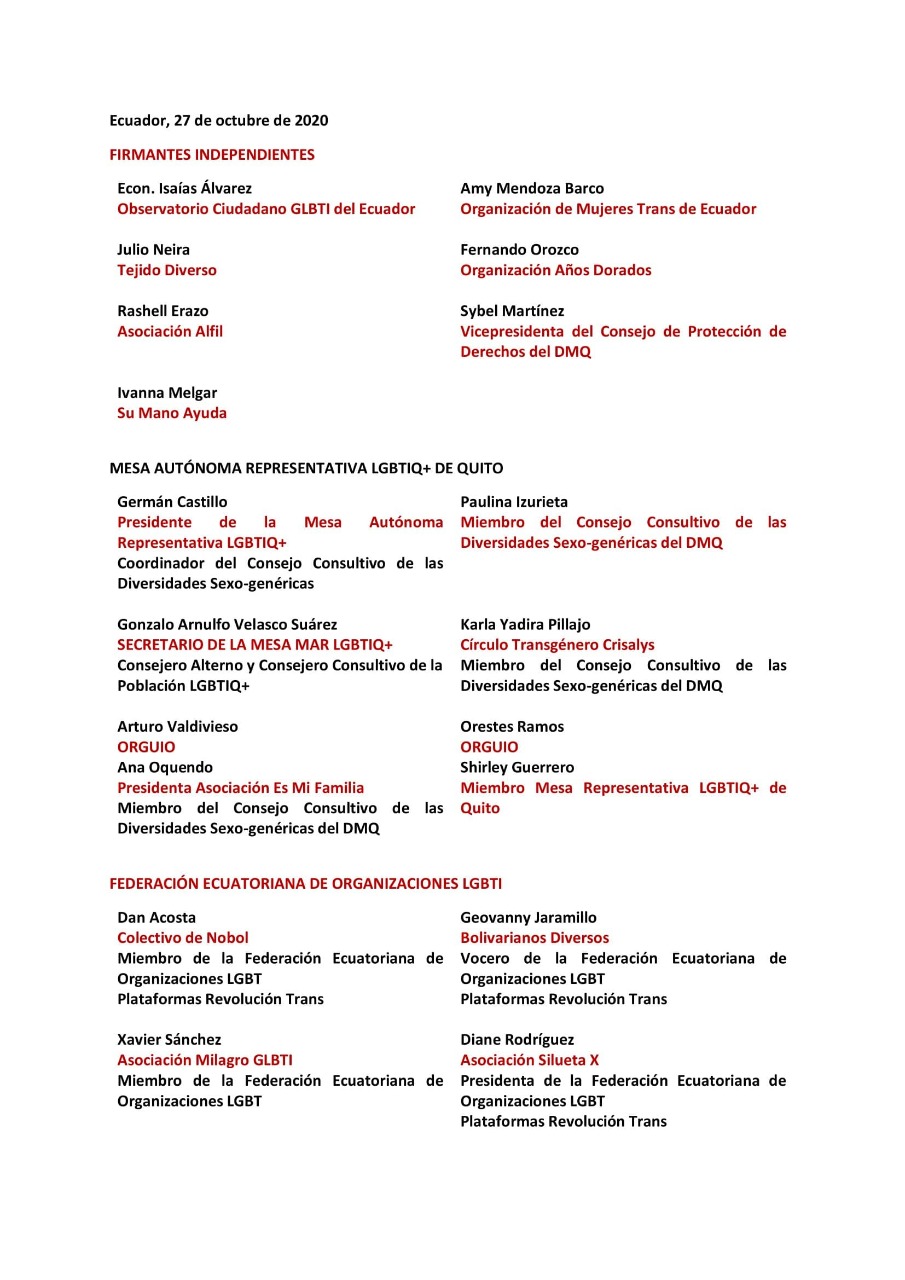 Cabe señalar que los/as abajo firmantes, rechazamos categóricamente todo acto de violencia, extorsión o culquiera que tenga por finalidad el menoscabar la integridad de las personas y vulnerar los derechos humanos, independientemente de de su identidad sexual o identidad de género.