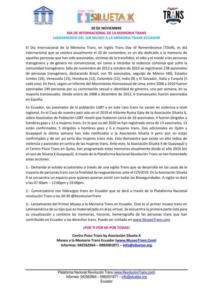 En Ecuador, los asesinatos de la población LGBT y en este caso trans no varían en violencia a nivel regional. En el Caso de nuestro país solo en el 2019 el Informe Ruma Sipiy de la Asociación Silueta X, sobre Asesinatos de Población LGBT reveló que hubieron cerca de 16 asesinatos, 4 fueron dirigidos a hombres gays y 12 a mujeres trans. En lo que va del 2020 se han registrado cerca de 13 asesinatos, 11 están confirmados, 5 dirigidos a hombres gays y 6 a mujeres trans. Dos adicionales en Quito y Guayaquil la última semana han sido notificados a la Asociación Silueta X pero aún no están confirmados y de ser así sería dos mujeres trans más. Esto demuestra que existe un alto índice de violencia y asesinato en contra de las mujeres trans. Ante esto, la Asociación Silueta X de Guayaquil y el Centro Psico Trans en Quito, han programado estas memorias anualmente desde el año 2010 (en el caso de Silueta X Guayaquil). A través de la Plataforma Nacional Revolución Trans se han fomentado estas acciones: