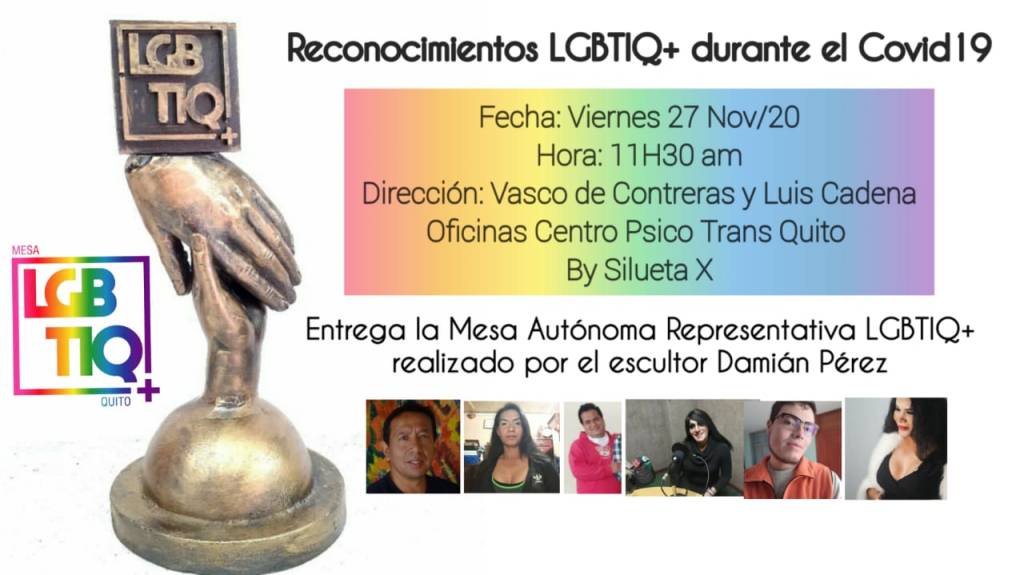 LA Mesa Autónoma Representativa LGBTIQ+ se complace en comunicarle que se le entregará un reconocimiento por su trabajo y acciones en pandemia Covid-19, para con la población de las Diversidades el día viernes 27 de noviembre a las 11h00 en el Centro Psico trans agradecemos su presencia para hacer entrega de éste reconocimiento.