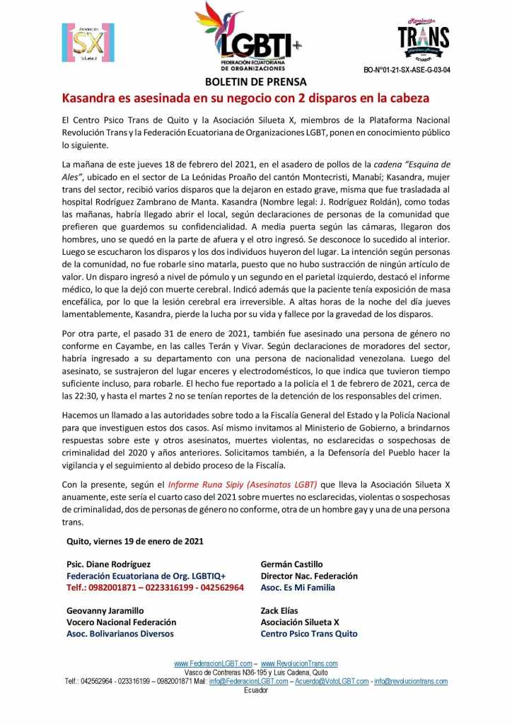 La mañana de este jueves 18 de febrero del 2021, en el asadero de pollos de la cadena “Esquina de Ales”, ubicado en el sector de La Leónidas Proaño del cantón Montecristi, Manabí; Kasandra, mujer trans del sector, recibió varios disparos que la dejaron en estado grave, misma que fue trasladada al hospital Rodríguez Zambrano de Manta. Kasandra (Nombre legal: J. Rodríguez Roldán), como todas las mañanas, habría llegado abrir el local, según declaraciones de personas de la comunidad que prefieren que guardemos su confidencialidad. A media puerta según las cámaras, llegaron dos hombres, uno se quedó en la parte de afuera y el otro ingresó. Se desconoce lo sucedido al interior. Luego se escucharon los disparos y los dos individuos huyeron del lugar. La intención según personas de la comunidad, no fue robarle sino matarla, puesto que no hubo sustracción de ningún artículo de valor. Un disparo ingresó a nivel de pómulo y un segundo en el parietal izquierdo, destacó el informe médico, lo que la dejó con muerte cerebral. Indicó además que la paciente tenía exposición de masa encefálica, por lo que la lesión cerebral era irreversible. A altas horas de la noche del día jueves lamentablemente, Kasandra, pierde la lucha por su vida y fallece por la gravedad de los disparos.