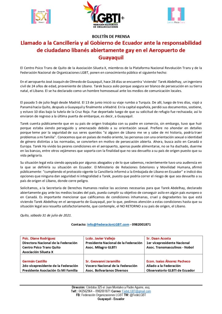 Llamado a la Cancillería y al Gobierno de Ecuador ante la responsabilidad de ciudadano libanés abiertamente gay en el Aeropuerto de