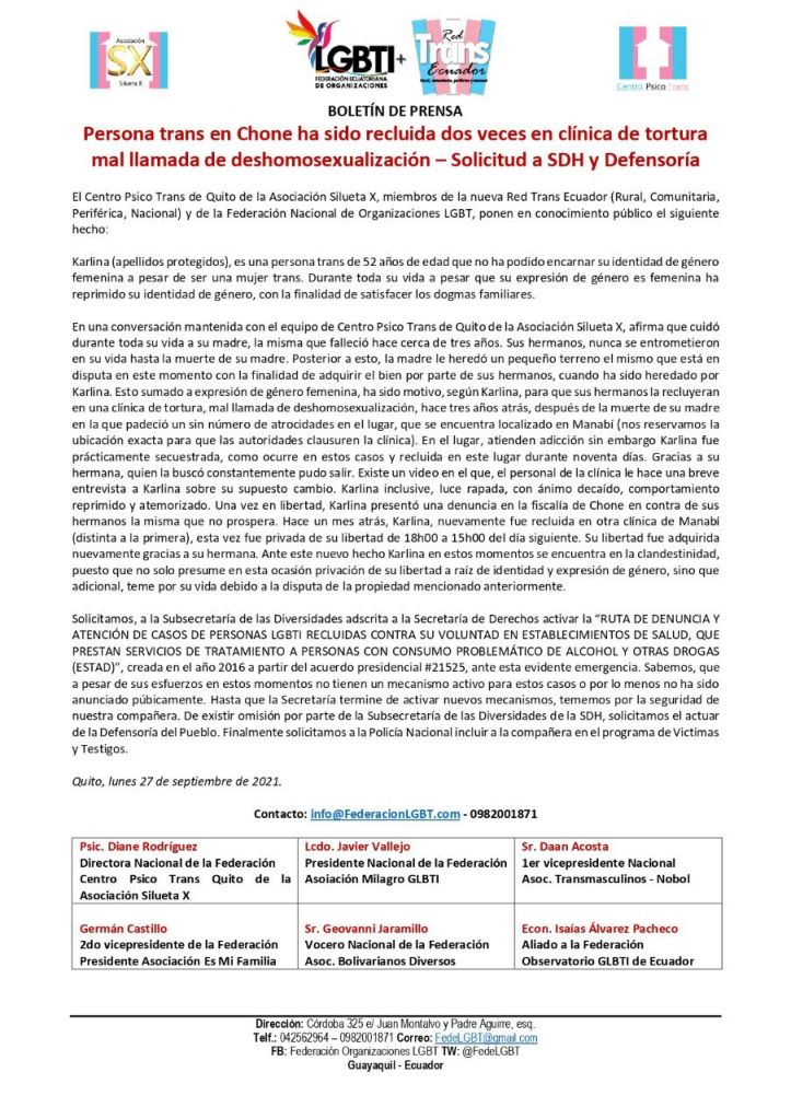 El Centro Psico Trans de Quito de la Asociación Silueta X, miembros de la nueva Red Trans Ecuador (Rural, Comunitaria, Periférica, Nacional) y de la Federación Nacional de Organizaciones LGBT, ponen en conocimiento público el siguiente hecho: