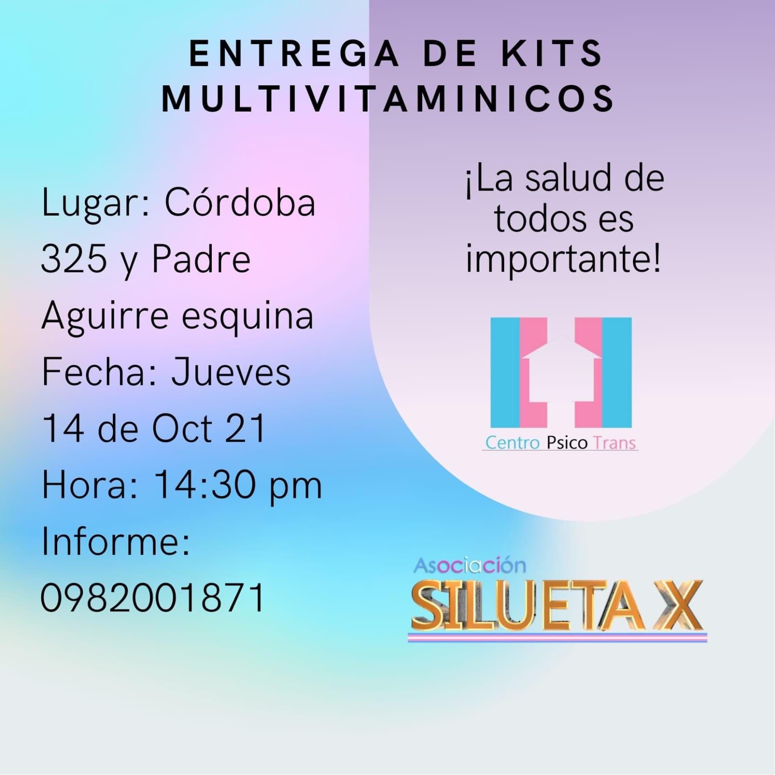 Mañana Jueves 14 de Octubre 2021, 14h30, en Córdoba 325 y Padre Aguirre esquina, entregaremos Kits multivitamínicos en la Asoc. Silueta X. Concluiremos la entrega con un Break.. Pueden inscribirse en el siguiente link (https://n9.cl/flpih) para asegurarse estar en la lista de beneficiarios.