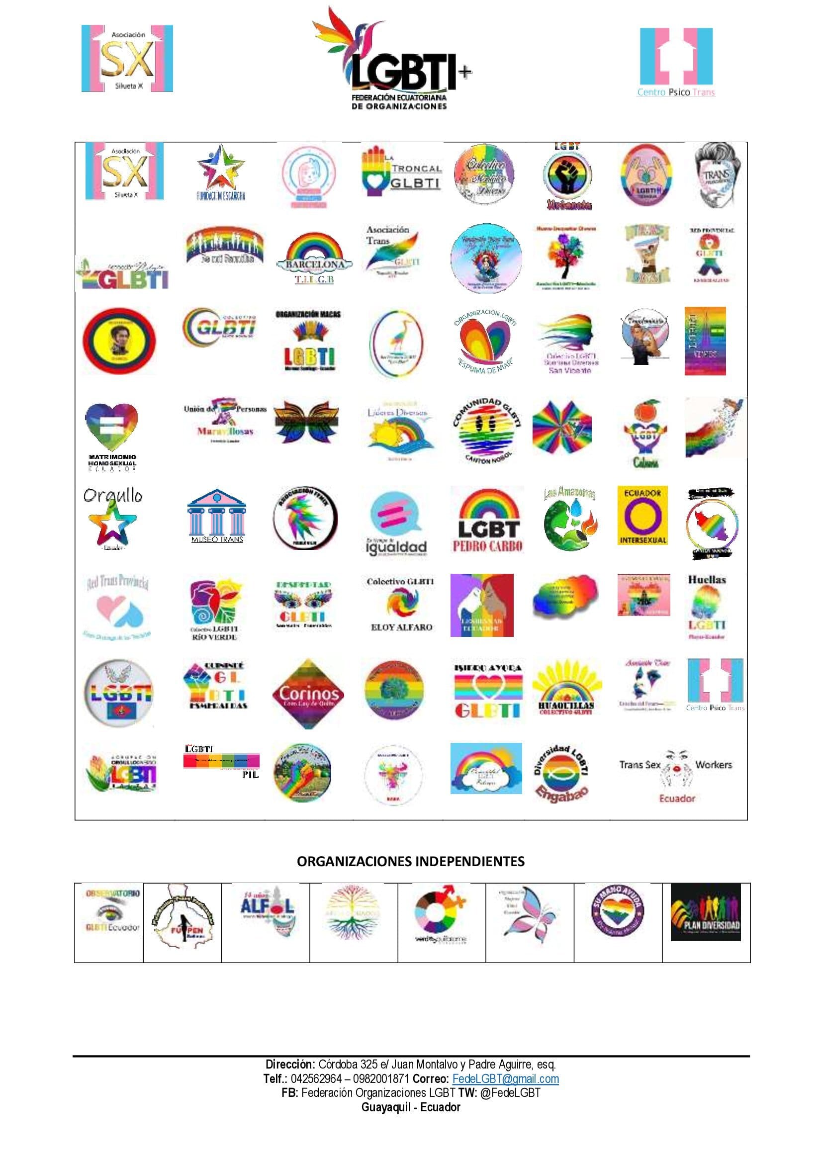 | Psic. Diane Rodríguez Directora Nacional de la Federación Centro Psico Trans Quito de la Asociación Silueta X | Lcdo. Javier Vallejo Presidente Nacional de la Federación Asoiación Milagro GLBTI | Sr. Daan Acosta 1er vicepresidente Nacional Asoc. Transmasculinos – Nobol |