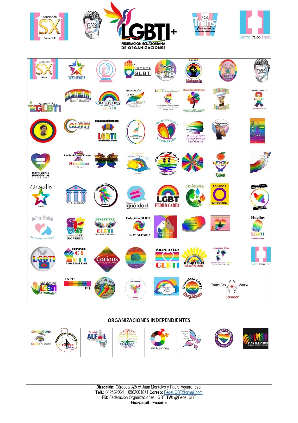 | Psic. Diane Rodríguez Directora Nacional de la Federación Centro Psico Trans Quito Asociación Silueta X | Lcdo. Javier Vallejo Presidente Nacional de la Federación Asoc. Milagro GLBTI | Sr. Daan Acosta 1er vicepresidente Nacional Asoc. Transmasculinos – Nobol |