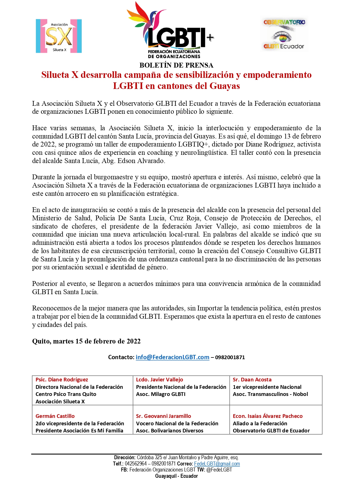 La Asociación Silueta X y el Observatorio GLBTI del Ecuador a través de la Federación ecuatoriana de organizaciones LGBTI ponen en conocimiento público lo siguiente.