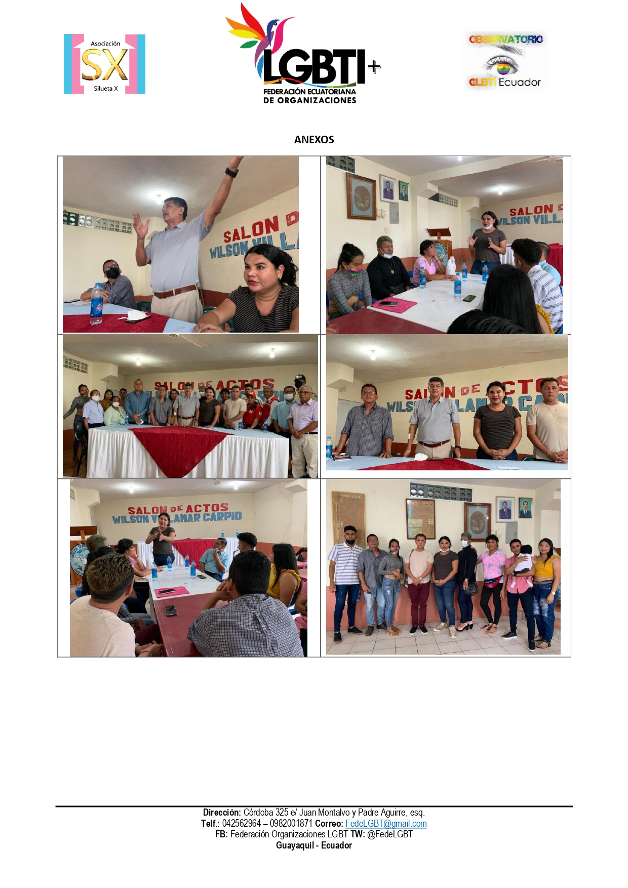 | Psic. Diane Rodríguez Directora Nacional de la Federación Centro Psico Trans Quito Asociación Silueta X | Lcdo. Javier Vallejo Presidente Nacional de la Federación Asoc. Milagro GLBTI | Sr. Daan Acosta 1er vicepresidente Nacional Asoc. Transmasculinos – Nobol |