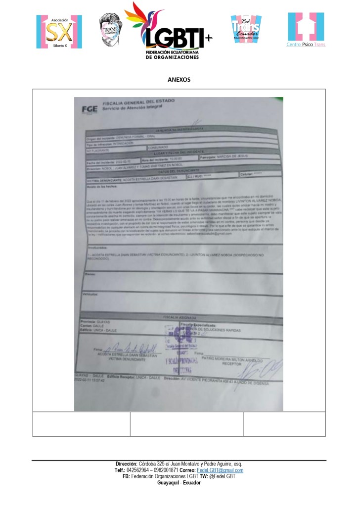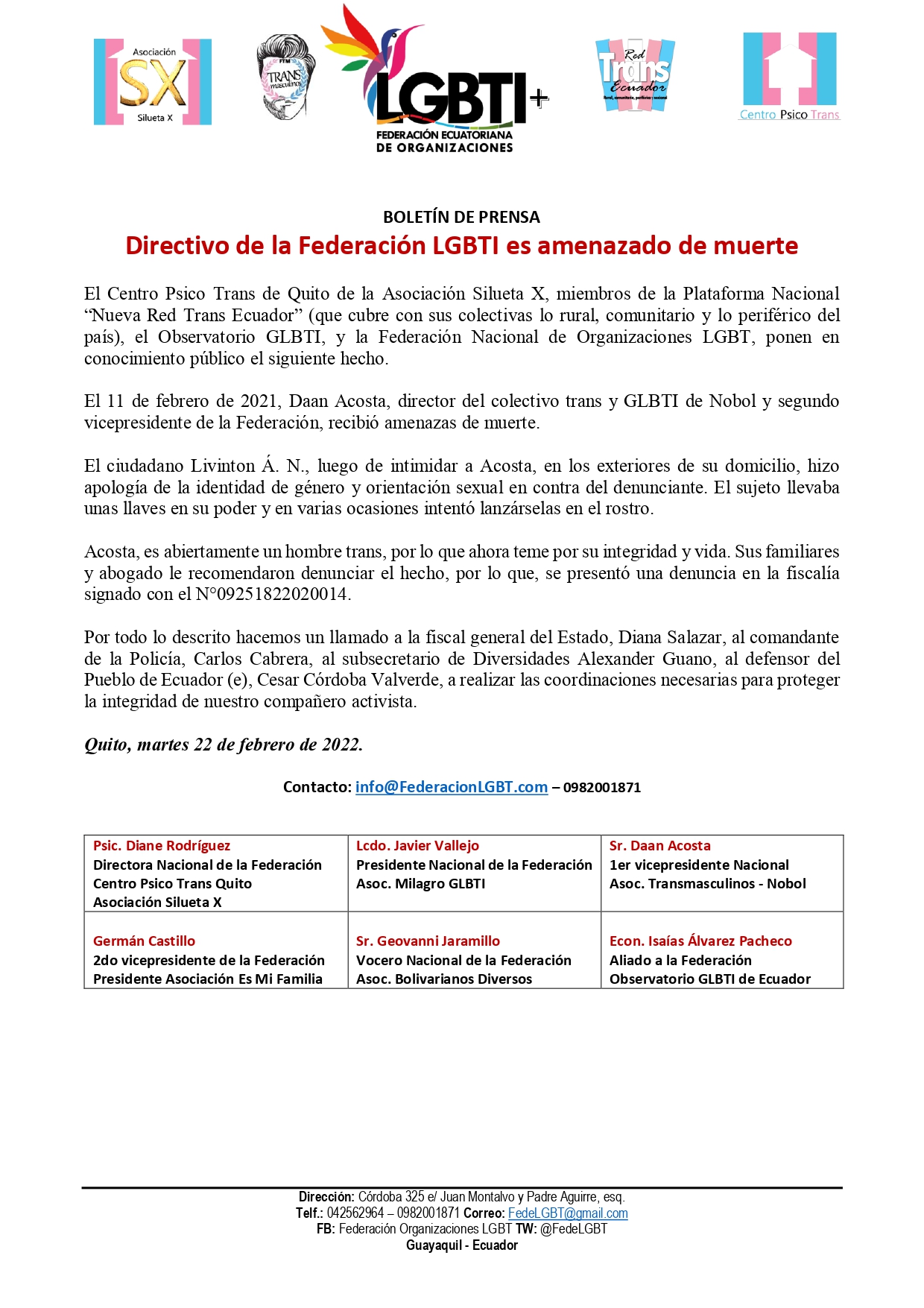 El Centro Psico Trans de Quito de la Asociación Silueta X, miembros de la Plataforma Nacional “Nueva Red Trans Ecuador” (que cubre con sus colectivas lo rural, comunitario y lo periférico del país), el Observatorio GLBTI, y la Federación Nacional de Organizaciones LGBT, ponen en conocimiento público el siguiente hecho.