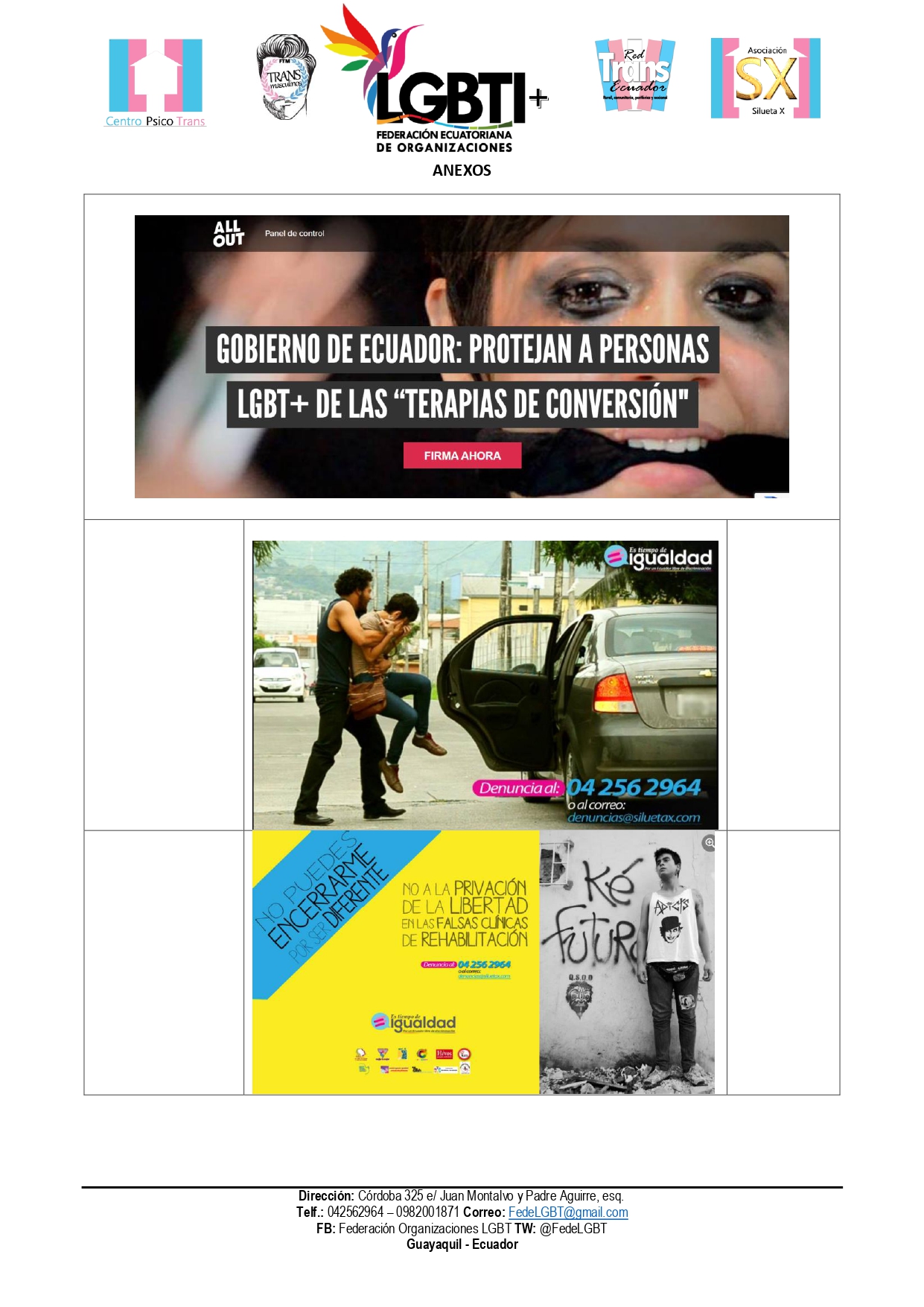 Las terapias de conversión y dichos centros siguen proliferando en Ecuador. En este sentido ponemos en conocimiento público que hemos iniciado una campaña para que la secretaria de Derechos Humanos active el Protocolo de intervención en casos de terapias de conversión por identidad de género y orientación sexual. Para tales efectos, solicitamos que se firme la solicitud en All Out y adicional lo compartan: