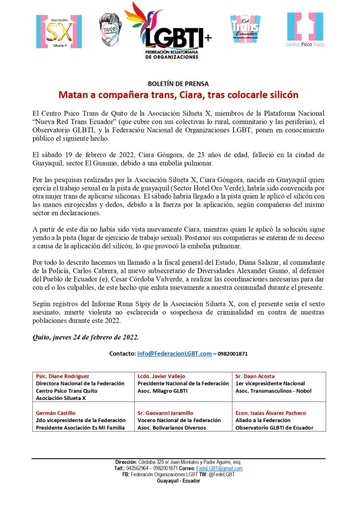 El Centro Psico Trans de Quito de la Asociación Silueta X, miembros de la Plataforma Nacional “Nueva Red Trans Ecuador” (que cubre con sus colectivas lo rural, comunitario y las periferias), el Observatorio GLBTI, y la Federación Nacional de Organizaciones LGBT, ponen en conocimiento público el siguiente hecho.