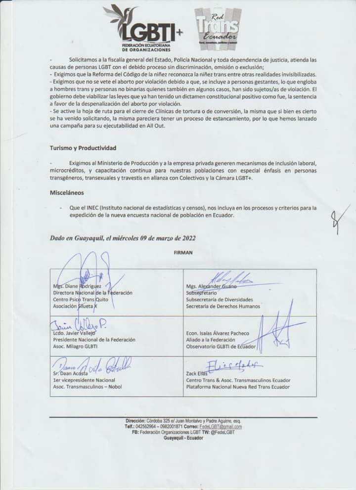 Adjunto al presente comunicado encontrará las demandas de los diferentes colectivos de la Federación Ecuatoriana de organizaciones LGBTI y la Plataforma Nacional Nueva Red Trans, mismos que fueron firmadas en el acto por parte del subsecretario de diversidades, Mgs. Alexander Guano, junto a la Mgs. Diane Rodríguez, al Lcdo. Javier Vallejo, al Sr. Daan Acosta, al Sr. Zack Elías, al Mgs. Isaías Álvarez, entre otros.
