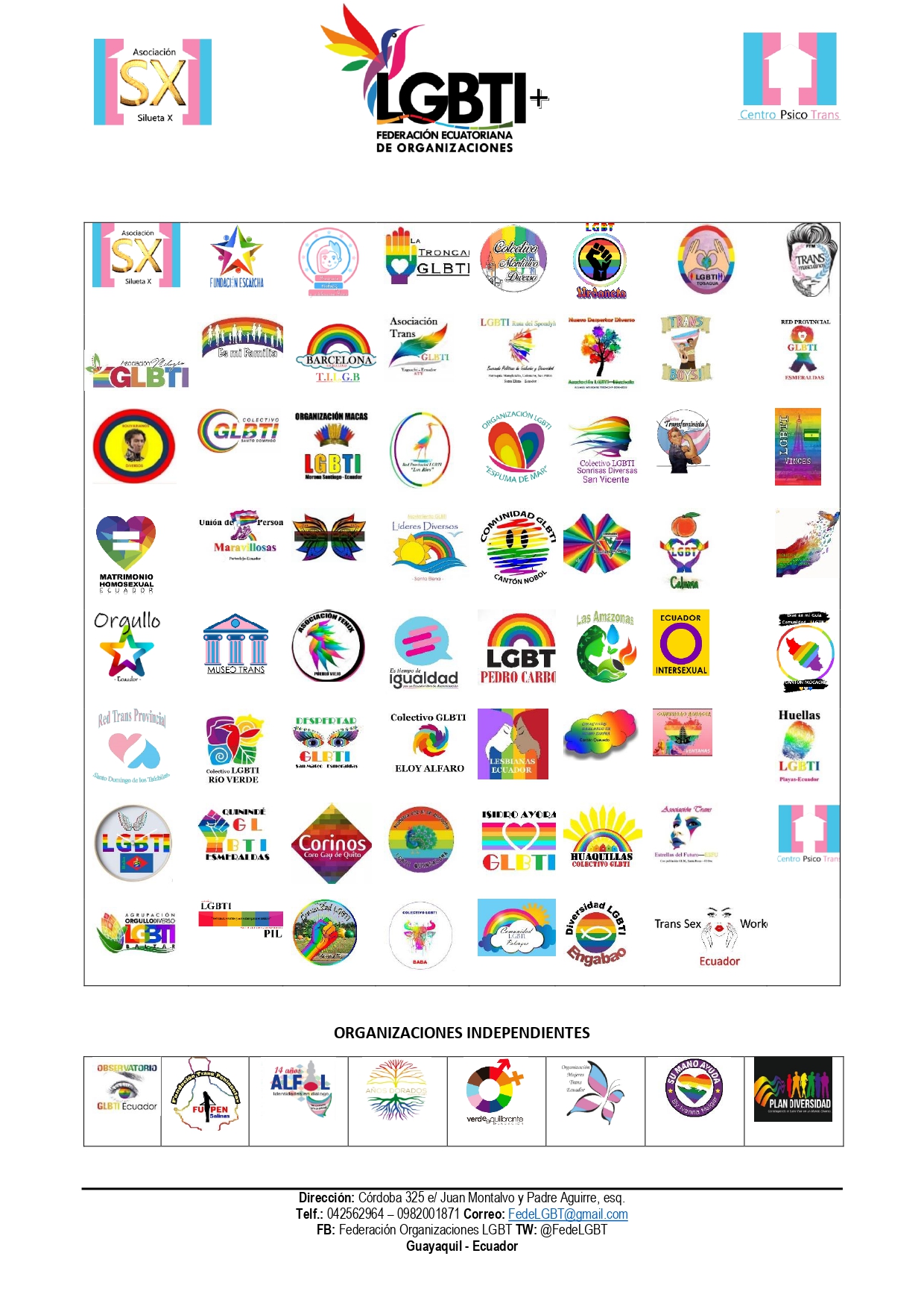 | Psic. Diane Rodríguez Directora Nacional de la Federación Centro Psico Trans Quito Asociación Silueta X | Lcdo. Javier Vallejo Presidente Nacional de la Federación Asoc. Milagro GLBTI | Sr. Daan Acosta 1er vicepresidente Nacional Asoc. Transmasculinos – Nobol |
