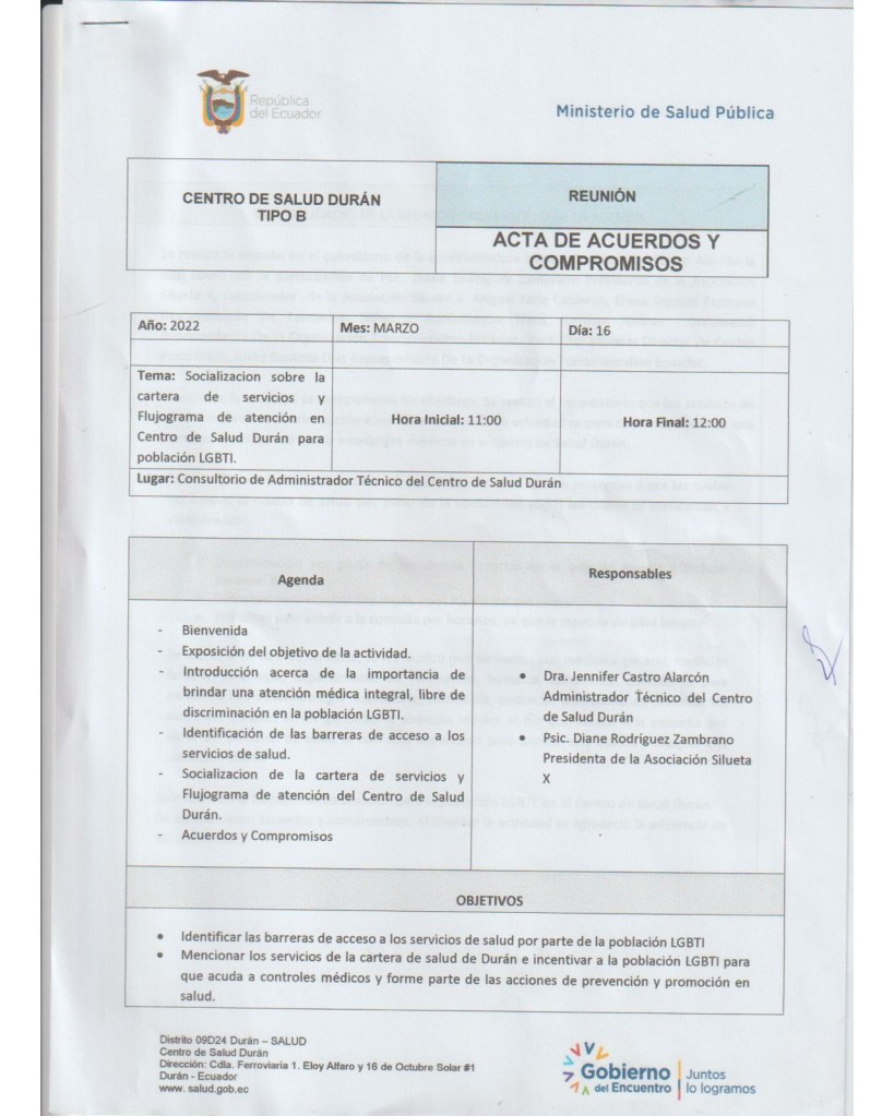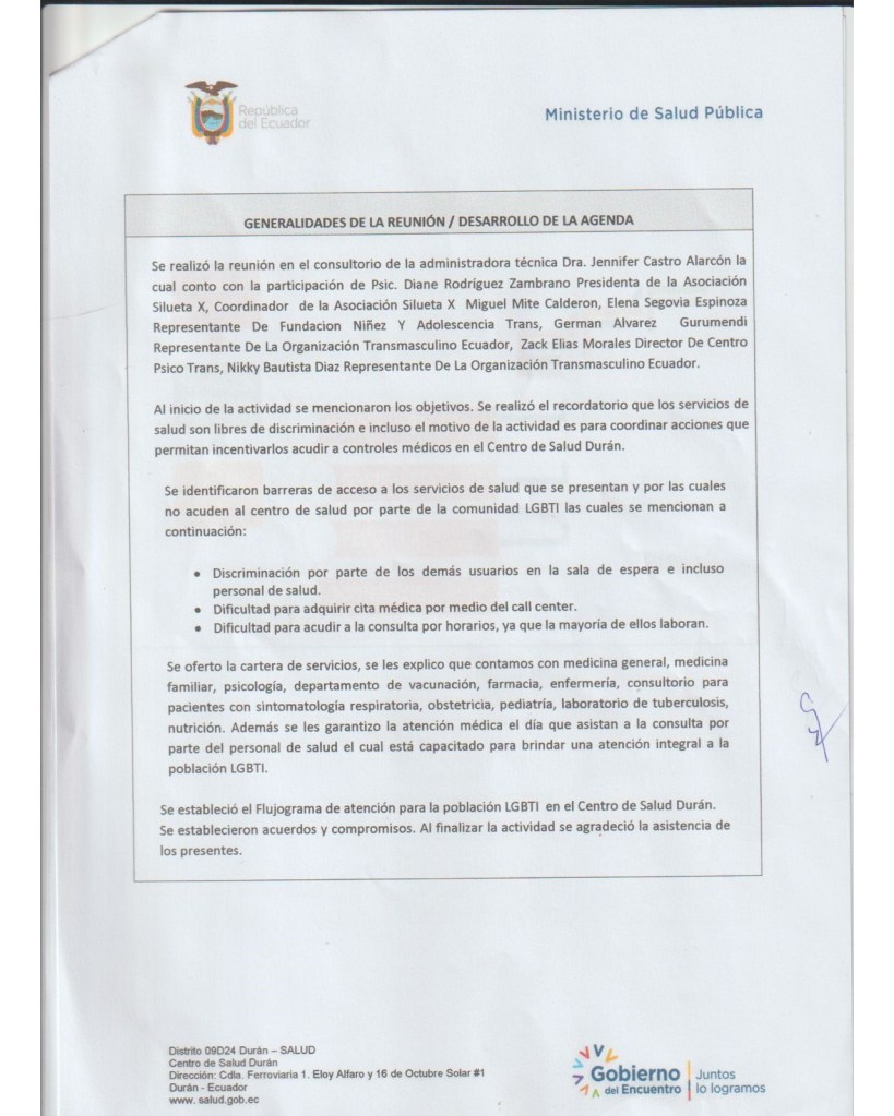 En una alianza hemos firmado un acuerdo para el acceso integral de nuestras poblaciones que incluye TRH En una alianza hemos firmado un acuerdo para el acceso integral de nuestras poblaciones que incluye TRH (Terapias de Reemplazo Hormonal) con derivaciones a 2do nivel. Existen además otros compromisos por lo que, aplaudimos la apertura del Centro Salud Duran Tipo B, para nuestras poblaciones trans e Intersex. En el acuerdo con el Ministerio participaron la Asociación Silueta X, Transmasculinos Ecuador, Niñez y Adolescencia Trans miembro de la Plataforma nacional Nueva Red Trans Ecuador.