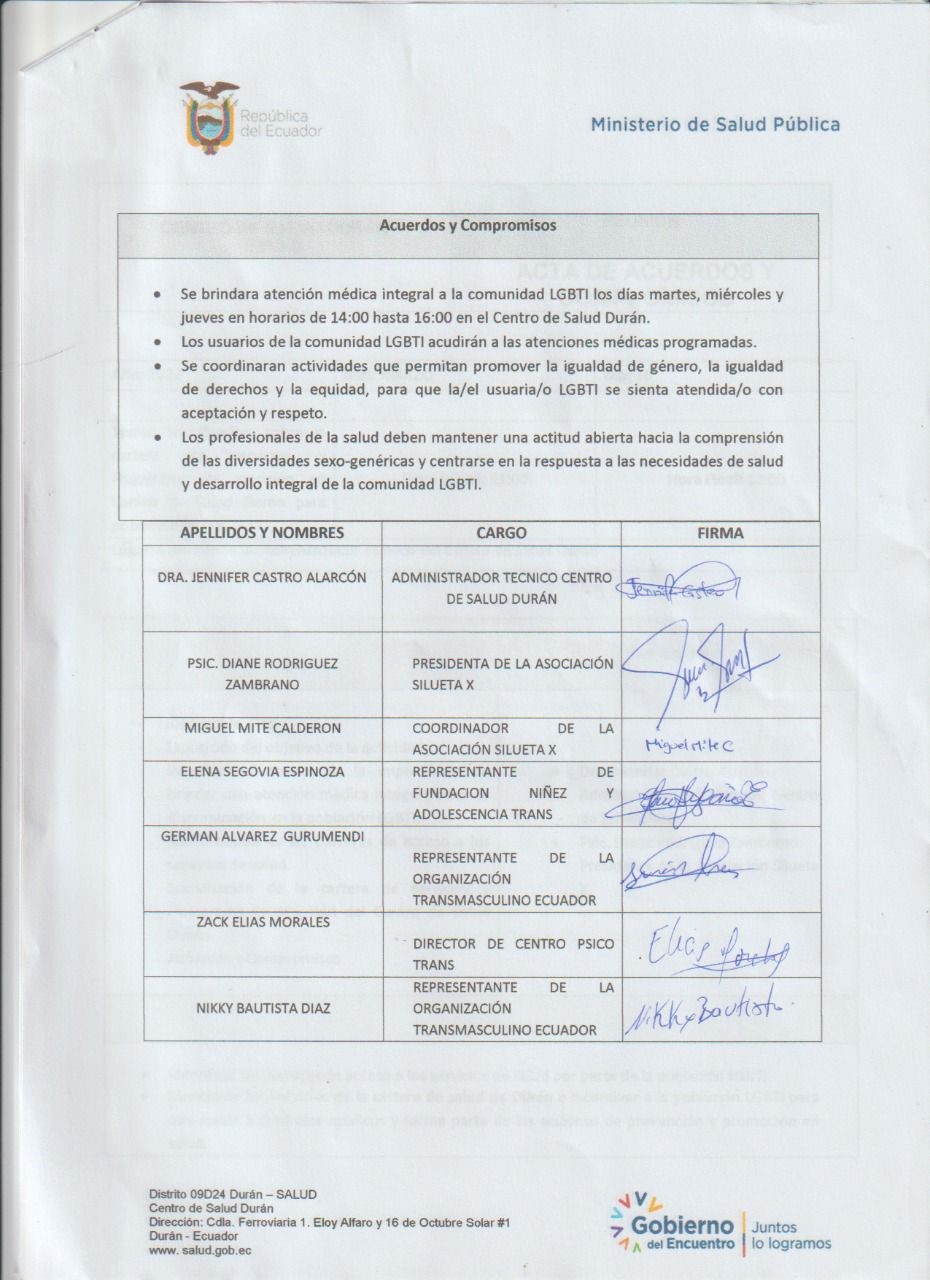 En una alianza hemos firmado un acuerdo para el acceso integral de nuestras poblaciones que incluye TRH En una alianza hemos firmado un acuerdo para el acceso integral de nuestras poblaciones que incluye TRH (Terapias de Reemplazo Hormonal) con derivaciones a 2do nivel. Existen además otros compromisos por lo que, aplaudimos la apertura del Centro Salud Duran Tipo B, para nuestras poblaciones trans e Intersex. En el acuerdo con el Ministerio participaron la Asociación Silueta X, Transmasculinos Ecuador, Niñez y Adolescencia Trans miembro de la Plataforma nacional Nueva Red Trans Ecuador.