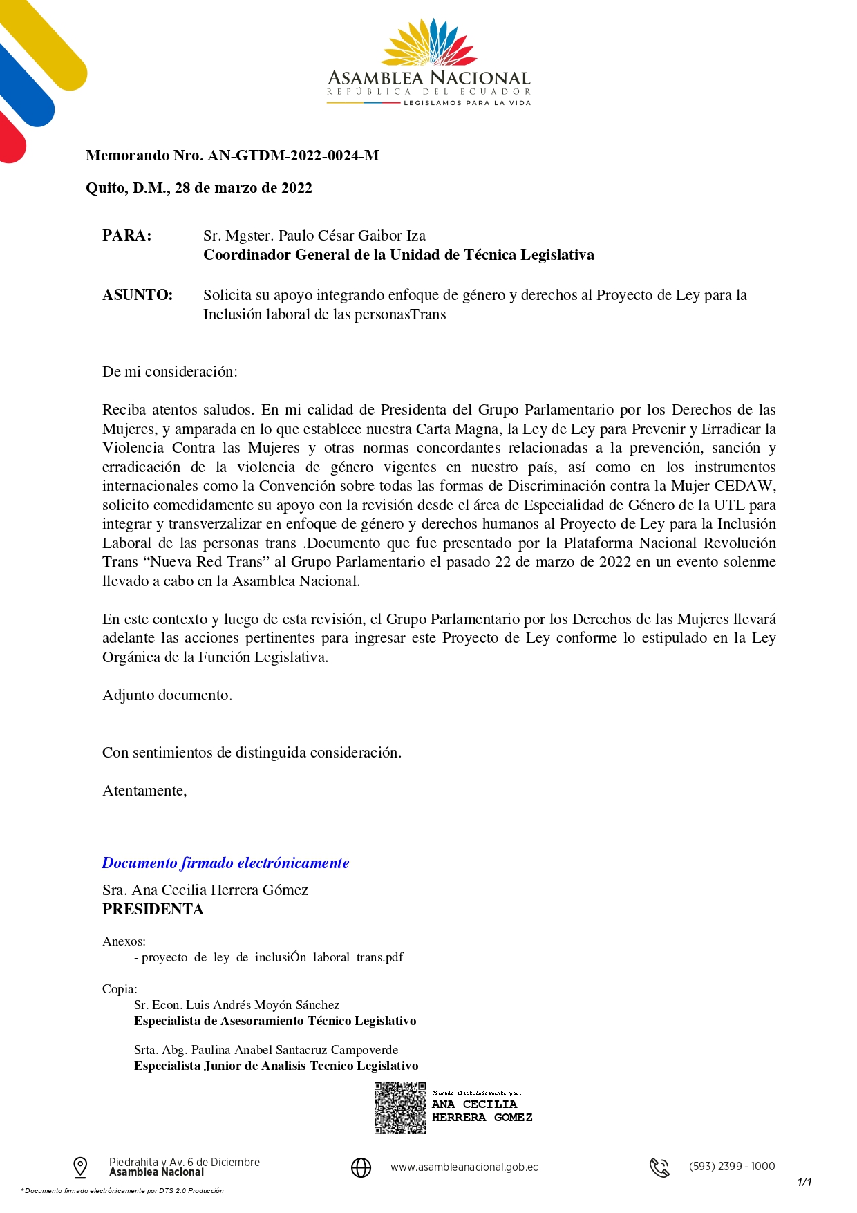 Luego de dar el primer paso al presentar la propuesta de ley de inclusión laboral trans, elaborada por la Asociación Silueta X, aportada por la Asociación Transmasculinos Ecuador y revisada legalmente por la Cámara LGBT de Comercio Ecuador y apoyada por la Plataforma Nacional revolución Trans «Nueva red Trans», esta ha sido enviada a la Coordinación General de la Unidad Técnica legislativa de la Asamblea Nacional, como segundo paso del proceso. Les mantendremos al tanto del proceso. A continuación el oficio.