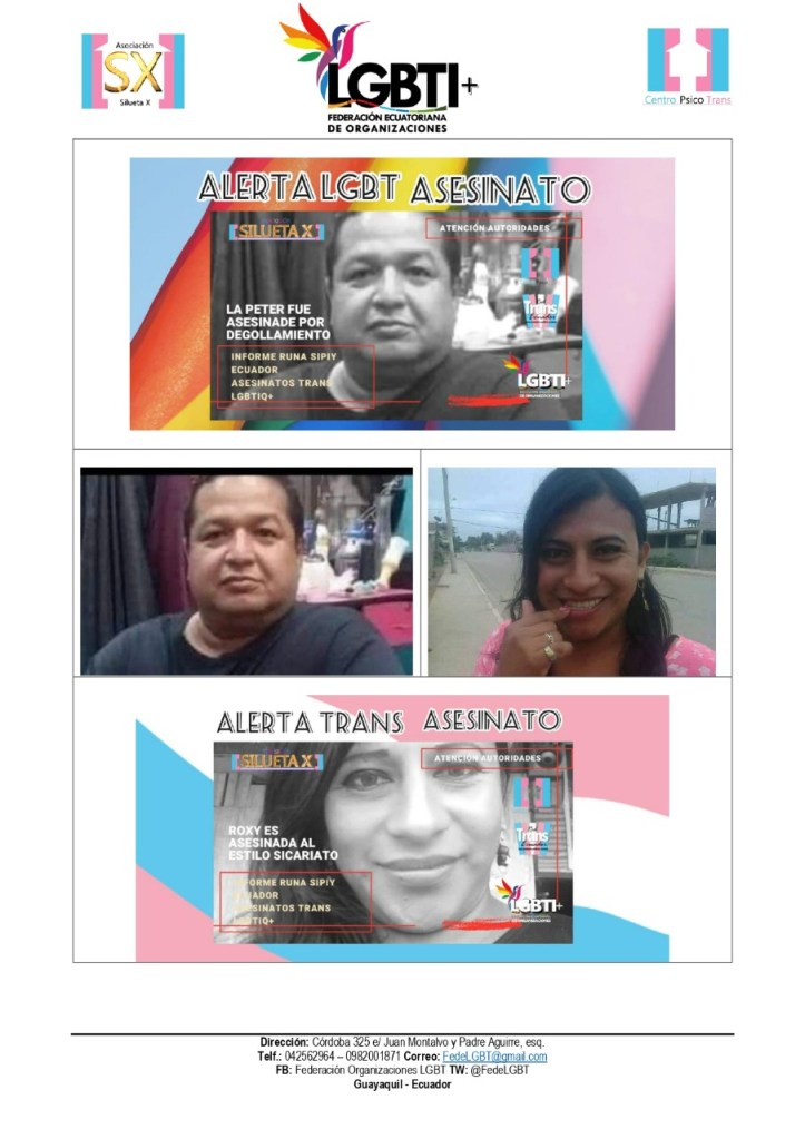 El Centro Psico Trans de Quito de la Asociación Silueta X, miembros de la Plataforma Nacional “Nueva Red Trans Ecuador” (que cubre con sus colectivas lo rural, comunitario y las periferias), el Observatorio GLBTI, y la Federación Nacional de Organizaciones LGBT, ponen en conocimiento público el siguiente hecho.