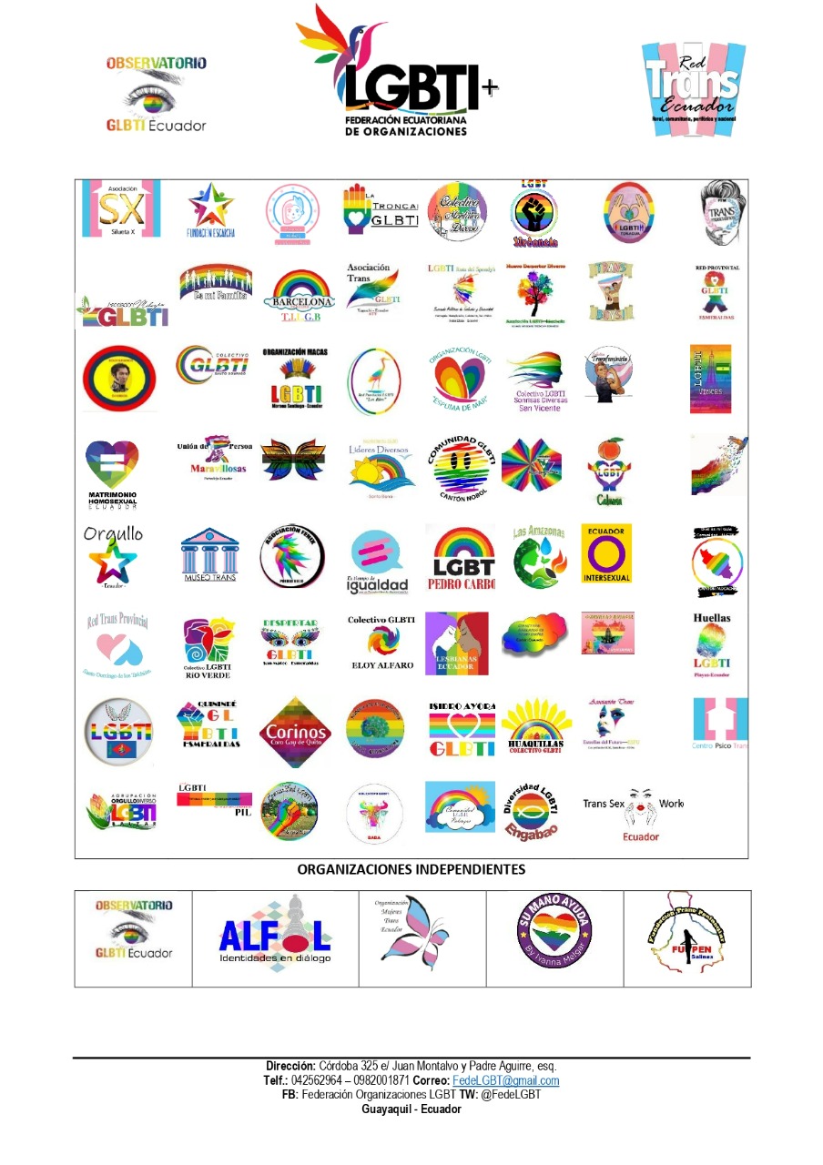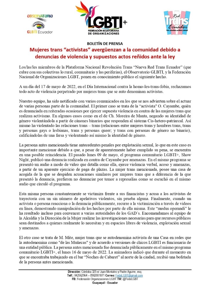 Los/las/les miembros de la Plataforma Nacional Revolución Trans “Nueva Red Trans Ecuador” (que cubre con sus colectivas lo rural, comunitario y las periferias), el Observatorio GLBTI, y la Federación Nacional de Organizaciones LGBT, ponen en conocimiento público el siguiente hecho.