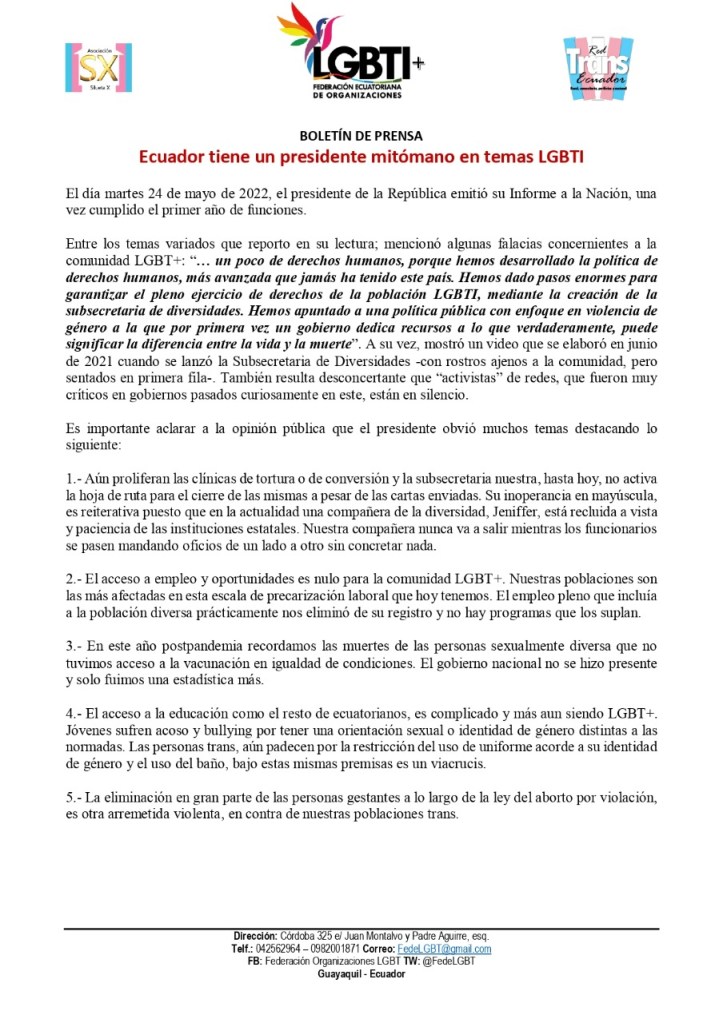 Denunciamos públicamente que no existe un solo avance significativo, en el país, en relación a la diversidad LGBT+ y que la Subsecretaria de Diversidades no concreta una sola política pública en nuestro beneficio. Hoy vemos a las/os grandes denunciólogas/os de gobiernos pasados en silencio y formando parte de instituciones del gobierno en altos cargos, mientras la comunidad LGBT+ se muere de hambre por el alto costo de la vida, a causa del alza de la gasolina y la falta de gobernabilidad.