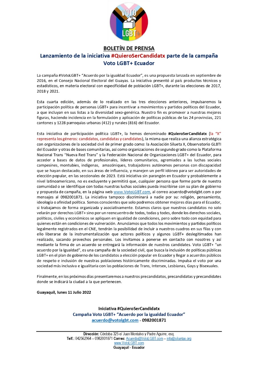 Esta iniciativa de participación política LGBT+, la hemos denominado #QuieroSerCandidatx (la “X” representa los géneros: candidatos, candidatas y candidates), la misma que realiza una alianza estratégica con organizaciones de la sociedad civil de primer grado como: la Asociación Silueta X, Observatorio GLBTI del Ecuador y otras de bases comunitarias, así como organizaciones de segundo grado como la Plataforma Nacional Trans “Nueva Red Trans” y la Federación Nacional de Organizaciones LGBT+ del Ecuador, para acceder a bases de datos de profesionales, líderes comunitarios, agremiades a las luchas sociales campesines, montubies, indígenas, amazóniques, trabajadores autónomos personas con discapacidad que se hayan destacado, en sus áreas de influencia, y manejen un perfil idóneo para ser autoridades de elección popular, en las seccionales de 2023. Está iniciativa sin parangón en Ecuador y probablemente a nivel latinoamericano, no es excluyente y permitirá que, cualquier persona que forme parte de nuestra comunidad o se identifique con todas nuestras luchas sociales pueda inscribirse con su plan de gobierno y propuesta de campaña, en la página web http://www.VotoLGBT.com, al correo acuerdo@votolgbt.com o por mensajes al 0982001871. La iniciativa tampoco discriminará a nadie por su: religión, pensamiento, ideología o afinidad política. Somos conscientes que solo podremos obtener mejores días para el Ecuador, si trabajamos de forma organizada y asociativamente. Estamos claros que nuestros candidatos no solo velarán por derechos LGBT+ sino por un reencuentro de todos, todas y todes, donde los derechos sociales, políticos, civiles y económicos se apliquen en igualdad de condiciones, pero sobre todo con equidad para quienes están en condiciones de vulneración. Anunciamos que todos los movimientos y partidos políticos legalmente registrados en el CNE, tendrán la posibilidad de incluir a nuestros cuadros en sus filas y con ello liberarse de la instrumentalización que actores políticos y algunos LGBT+ deslegitimados han realizado, sacando provechos personales. Los invitamos a ponerse en contacto con nosotres y así mediante la firma de un acuerdo se entregará la información de nuestros candidates. Voto LGBT+ “un acuerdo por la Igualdad”, es una campaña de la sociedad civil, que busca la inclusión de políticas públicas LGBT+ en el plan de gobierno de los candidatos a elección popular en Ecuador y llegar a acuerdos públicos de respeto e inclusión de nuestras poblaciones históricamente discriminadas. Impulsa el voto por una sociedad más inclusiva e igualitaria con las poblaciones de Trans, Intersex, Lesbianas, Gays y Bisexuales.