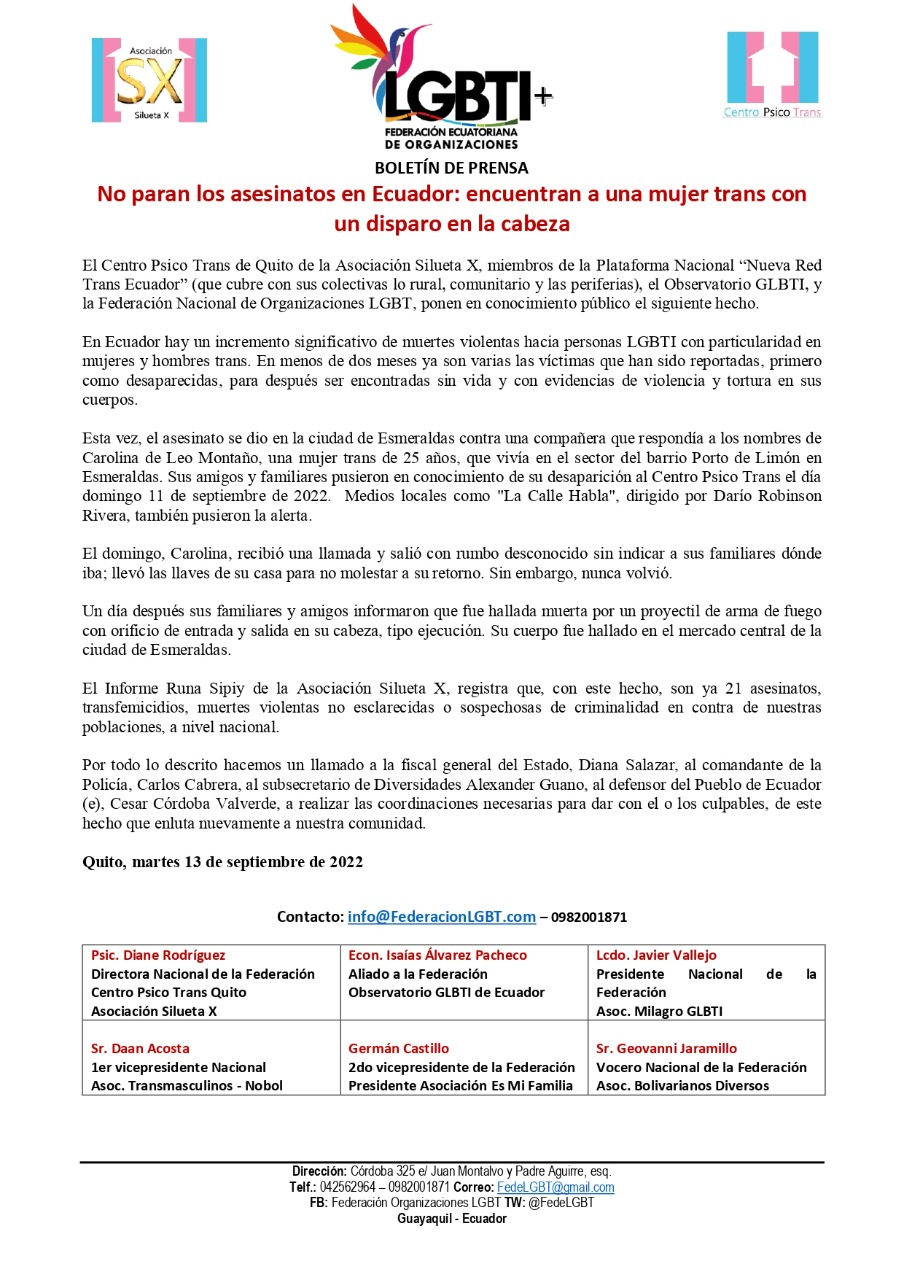 El Centro Psico Trans de Quito de la Asociación Silueta X, miembros de la Plataforma Nacional “Nueva Red Trans Ecuador” (que cubre con sus colectivas lo rural, comunitario y las periferias), el Observatorio GLBTI, y la Federación Nacional de Organizaciones LGBT, ponen en conocimiento público el siguiente hecho.