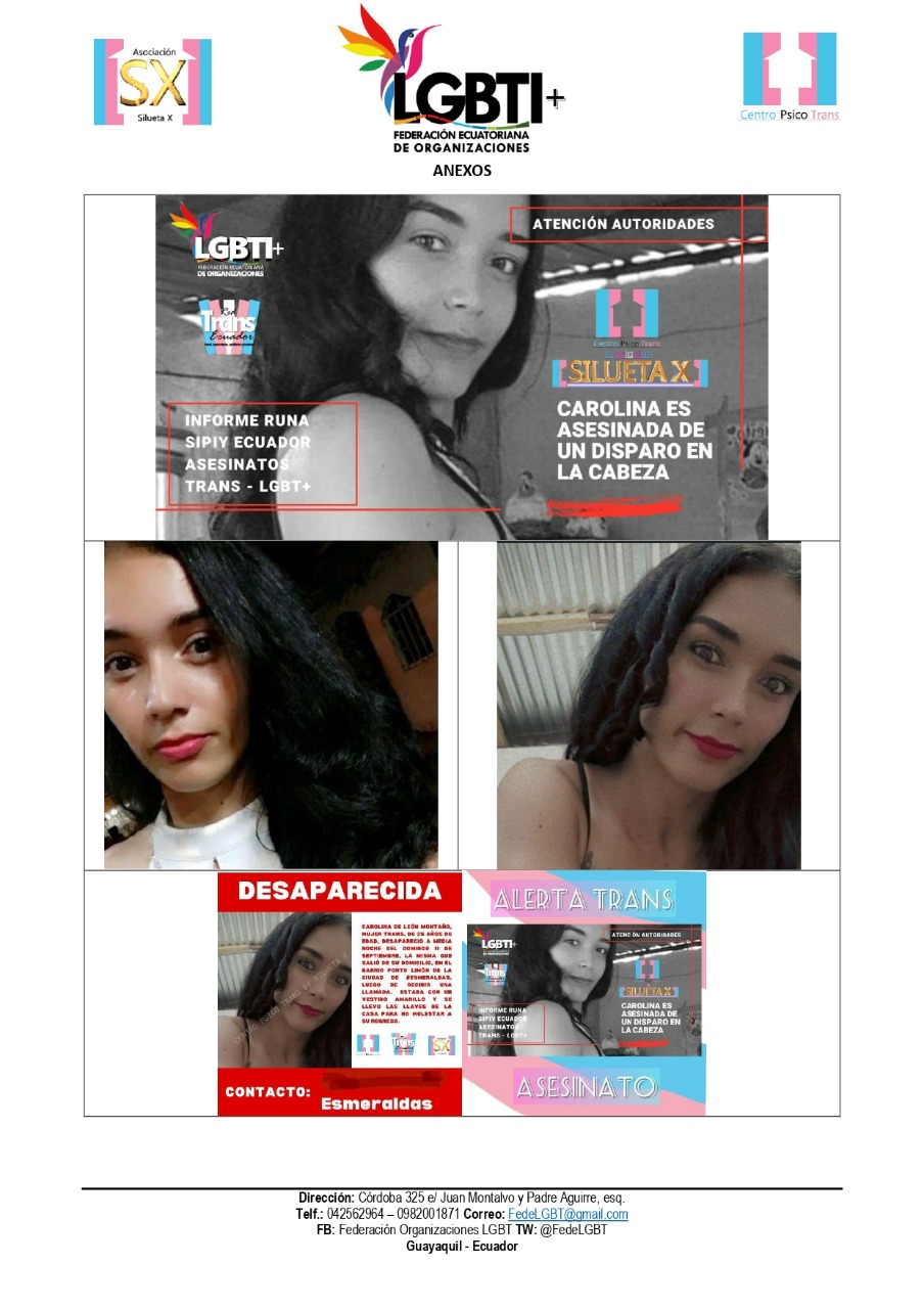 En Ecuador hay un incremento significativo de muertes violentas hacia personas LGBTI con particularidad en mujeres y hombres trans. En menos de dos meses ya son varias las víctimas que han sido reportadas, primero como desaparecidas, para después ser encontradas sin vida y con evidencias de violencia y tortura en sus cuerpos.