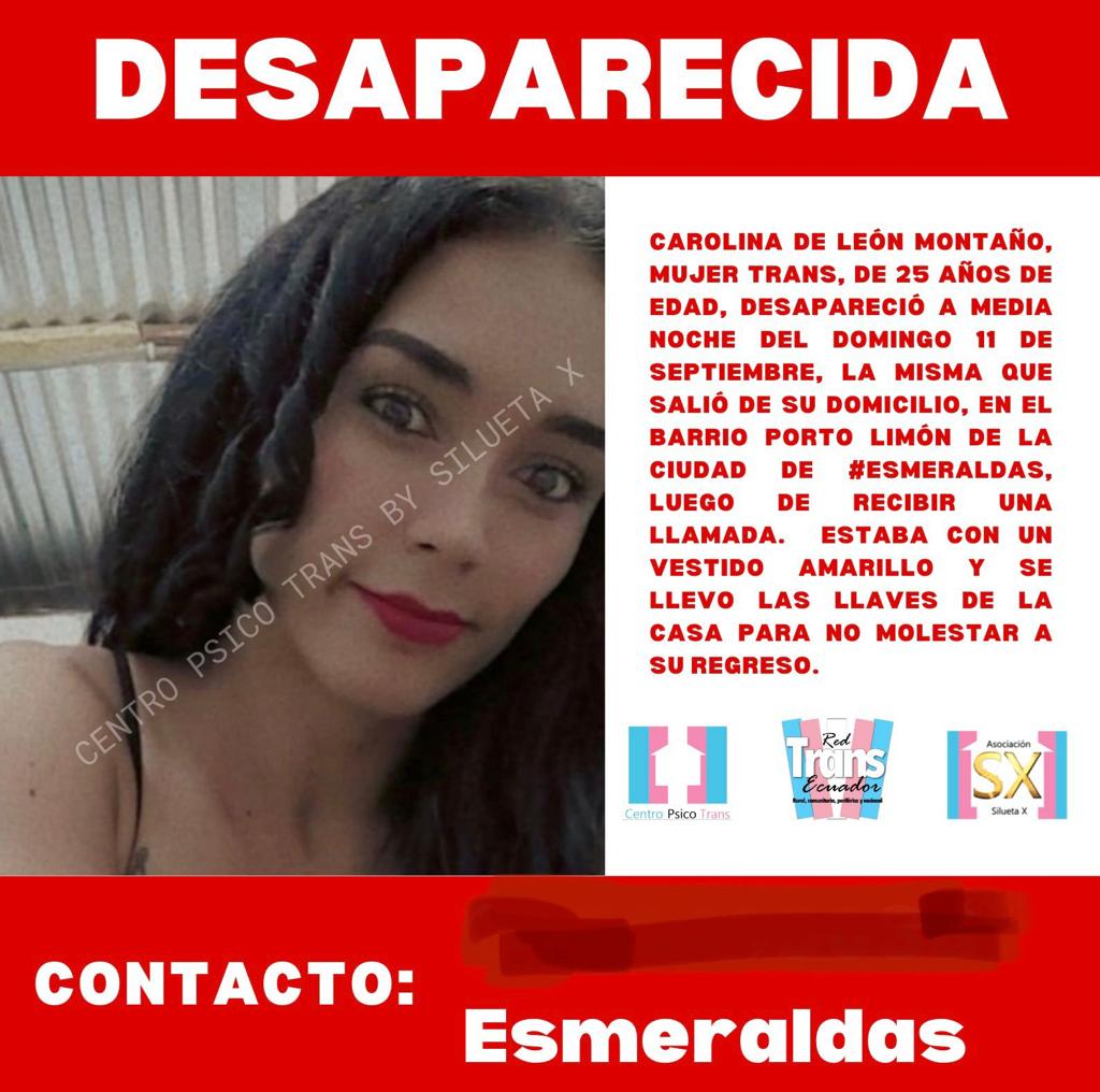 Esta vez, el asesinato se dio en la ciudad de Esmeraldas contra una compañera que respondía a los nombres de Carolina de Leo Montaño, una mujer trans de 25 años, que vivía en el sector del barrio Porto de Limón en Esmeraldas. Sus amigos y familiares pusieron en conocimiento de su desaparición al Centro Psico Trans el día domingo 11 de septiembre de 2022. Medios locales como «La Calle Habla», dirigido por Darío Robinson Rivera, también pusieron la alerta.