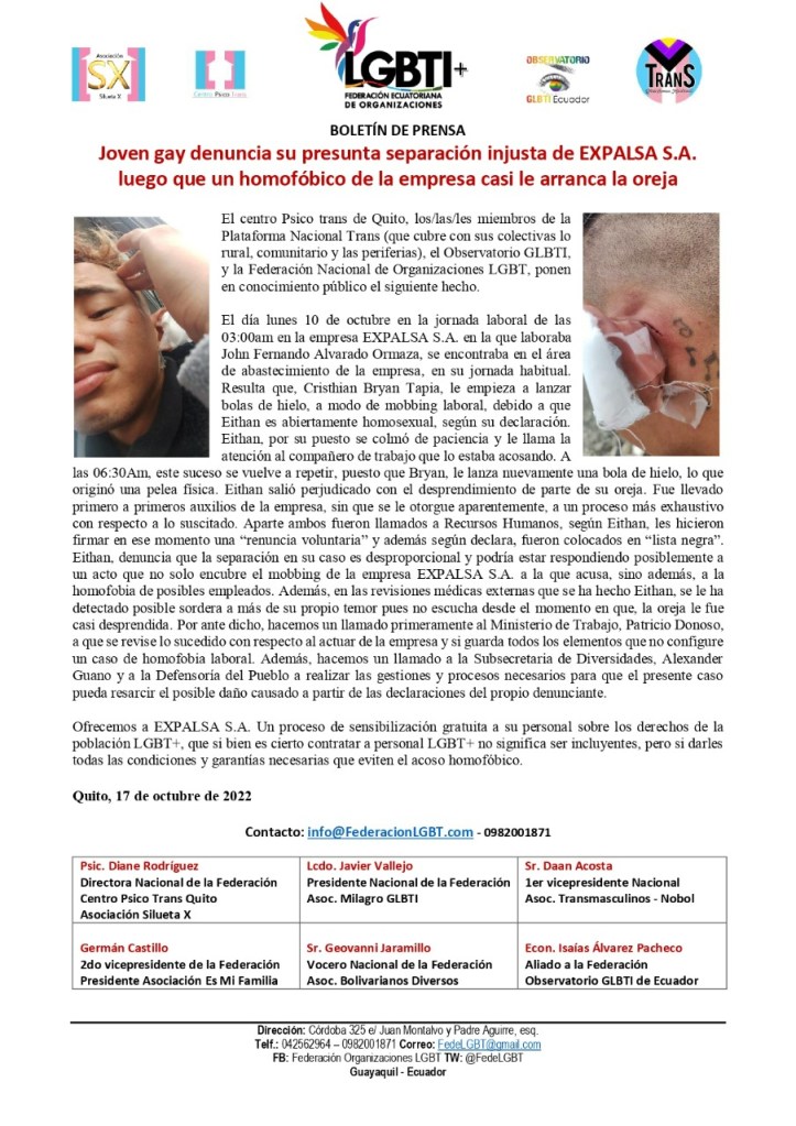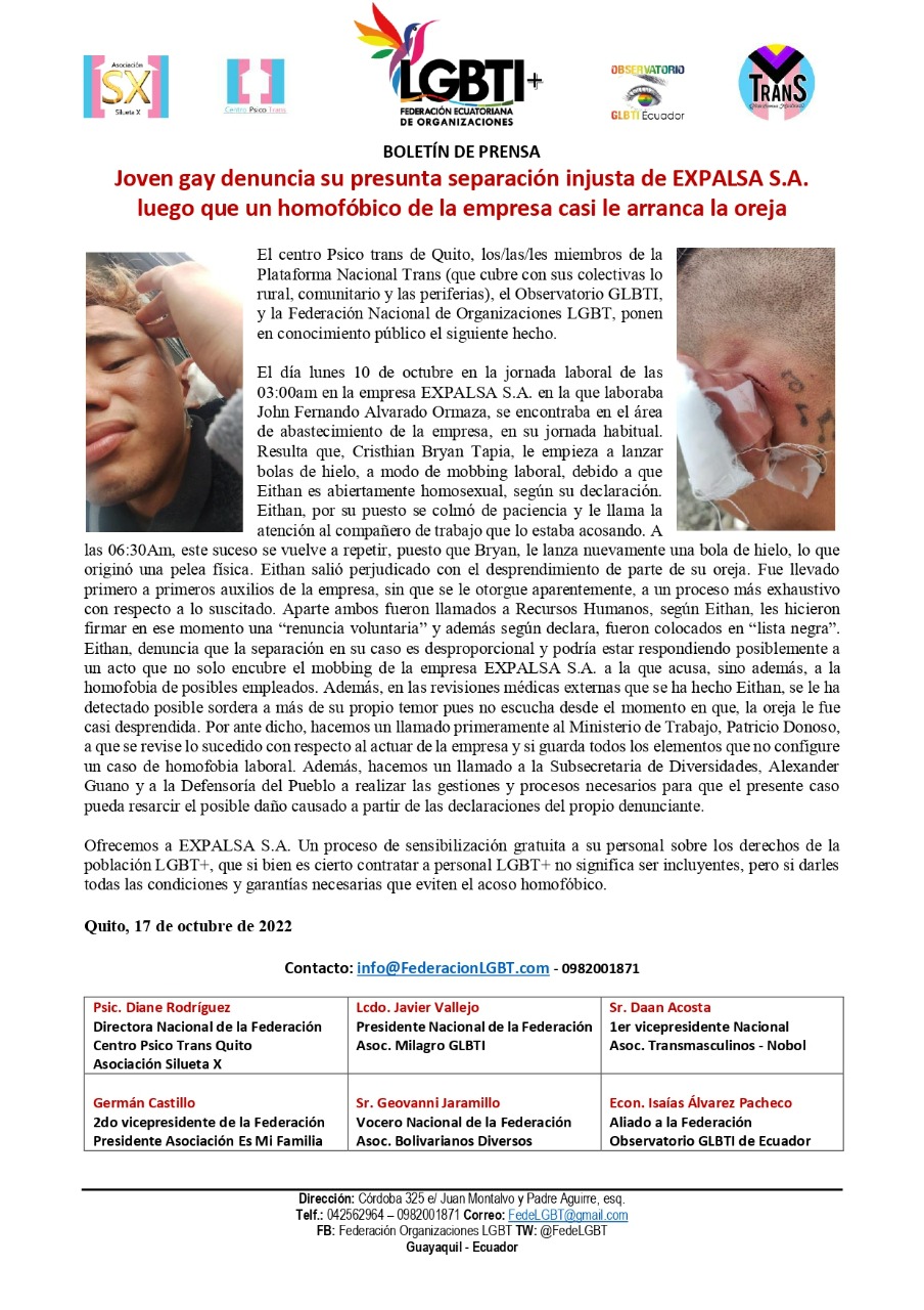 El día lunes 10 de octubre en la jornada laboral de las 03:00am en la empresa EXPALSA S.A. en la que laboraba John Fernando Alvarado Ormaza, se encontraba en el área de abastecimiento de la empresa, en su jornada habitual. Resulta que, Cristhian Bryan Tapia, le empieza a lanzar bolas de hielo, a modo de mobbing laboral, debido a que Eithan es abiertamente homosexual, según su declaración. Eithan, por su puesto se colmó de paciencia y le llama la atención al compañero de trabajo que lo estaba acosando. A las 06:30Am, este suceso se vuelve a repetir, puesto que Bryan, le lanza nuevamente una bola de hielo, lo que originó una pelea física. Eithan salió perjudicado con el desprendimiento de parte de su oreja. Fue llevado primero a primeros auxilios de la empresa, sin que se le otorgue aparentemente, a un proceso más exhaustivo con respecto a lo suscitado. Aparte ambos fueron llamados a Recursos Humanos, según Eithan, les hicieron firmar en ese momento una “renuncia voluntaria” y además según declara, fueron colocados en “lista negra”. Eithan, denuncia que la separación en su caso es desproporcional y podría estar respondiendo posiblemente a un acto que no solo encubre el mobbing de la empresa EXPALSA S.A. a la que acusa, sino además, a la homofobia de posibles empleados. Además, en las revisiones médicas externas que se ha hecho Eithan, se le ha detectado posible sordera a más de su propio temor pues no escucha desde el momento en que, la oreja le fue casi desprendida. Por ante dicho, hacemos un llamado primeramente al Ministerio de Trabajo, Patricio Donoso, a que se revise lo sucedido con respecto al actuar de la empresa y si guarda todos los elementos que no configure un caso de homofobia laboral. Además, hacemos un llamado a la Subsecretaria de Diversidades, Alexander Guano y a la Defensoría del Pueblo a realizar las gestiones y procesos necesarios para que el presente caso pueda resarcir el posible daño causado a partir de las declaraciones del propio denunciante.