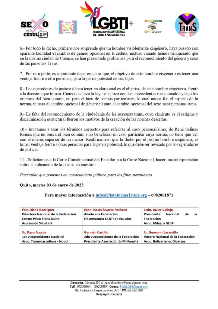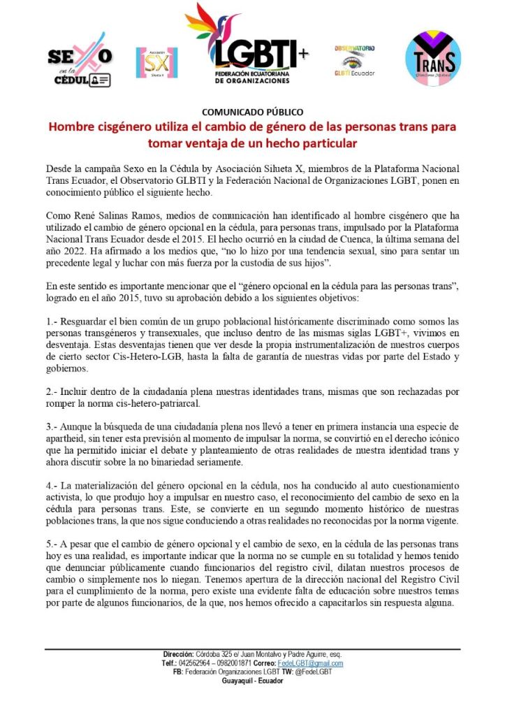 Desde la campaña Sexo en la Cédula by Asociación Silueta X, miembros de la Plataforma Nacional Trans Ecuador, el Observatorio GLBTI y la Federación Nacional de Organizaciones LGBT, ponen en conocimiento público el siguiente hecho.